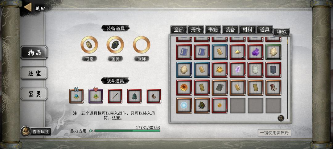 3.法宝荒炎号角(有召唤物效果)和青冥玄钟(限制BOSS行动),器灵云梦衣和东方
