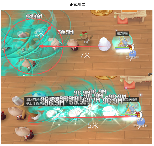 位置没有变动,截图视角也没变动,可以看到上图【银之光】的7米和周围3米从视觉上看,和【风灵疾走】的5米好像有点不对劲,【透射】判定根据施法技能的距离的话,感觉【银之光】的7米距离没问题,【风灵疾走】描述和计算都是5米,但是实际是不是能打到6米范围内的怪?因为【旋风】的12米和【银之光】能对上。如下图:
