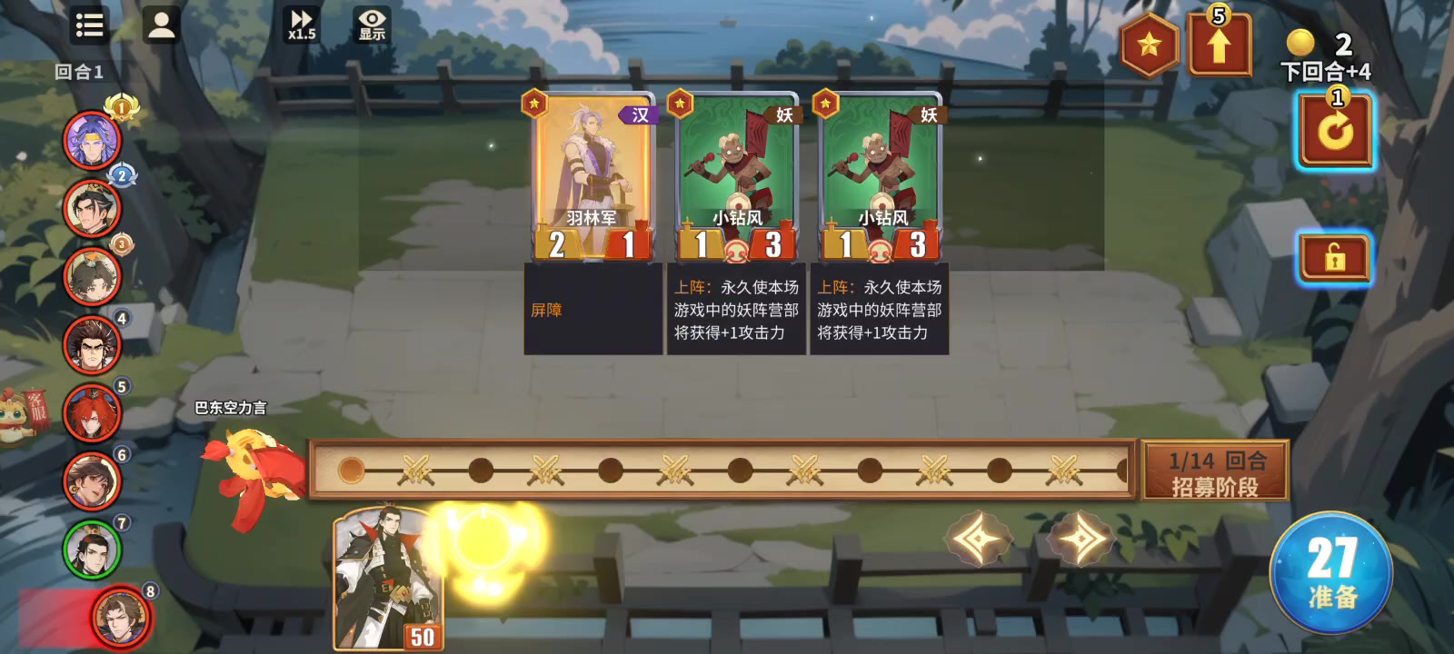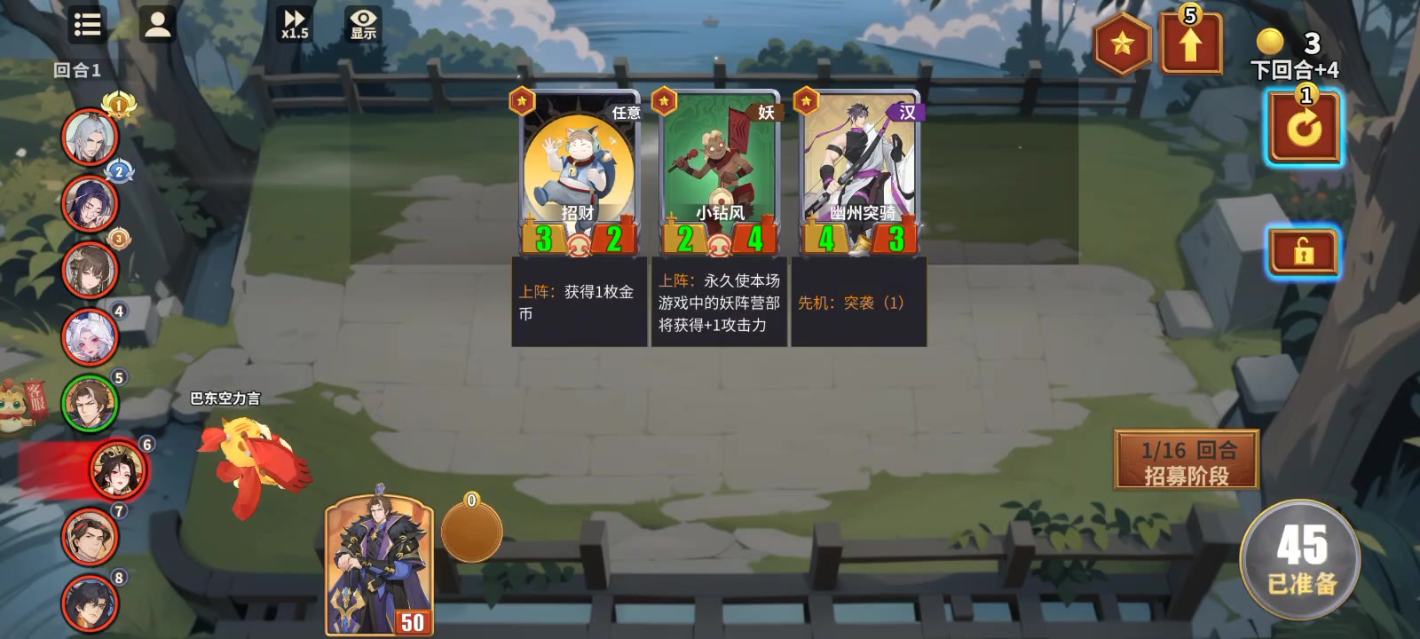第1回合:除了有需要配合的统帅开局买一个部将,其他统帅直接空过。