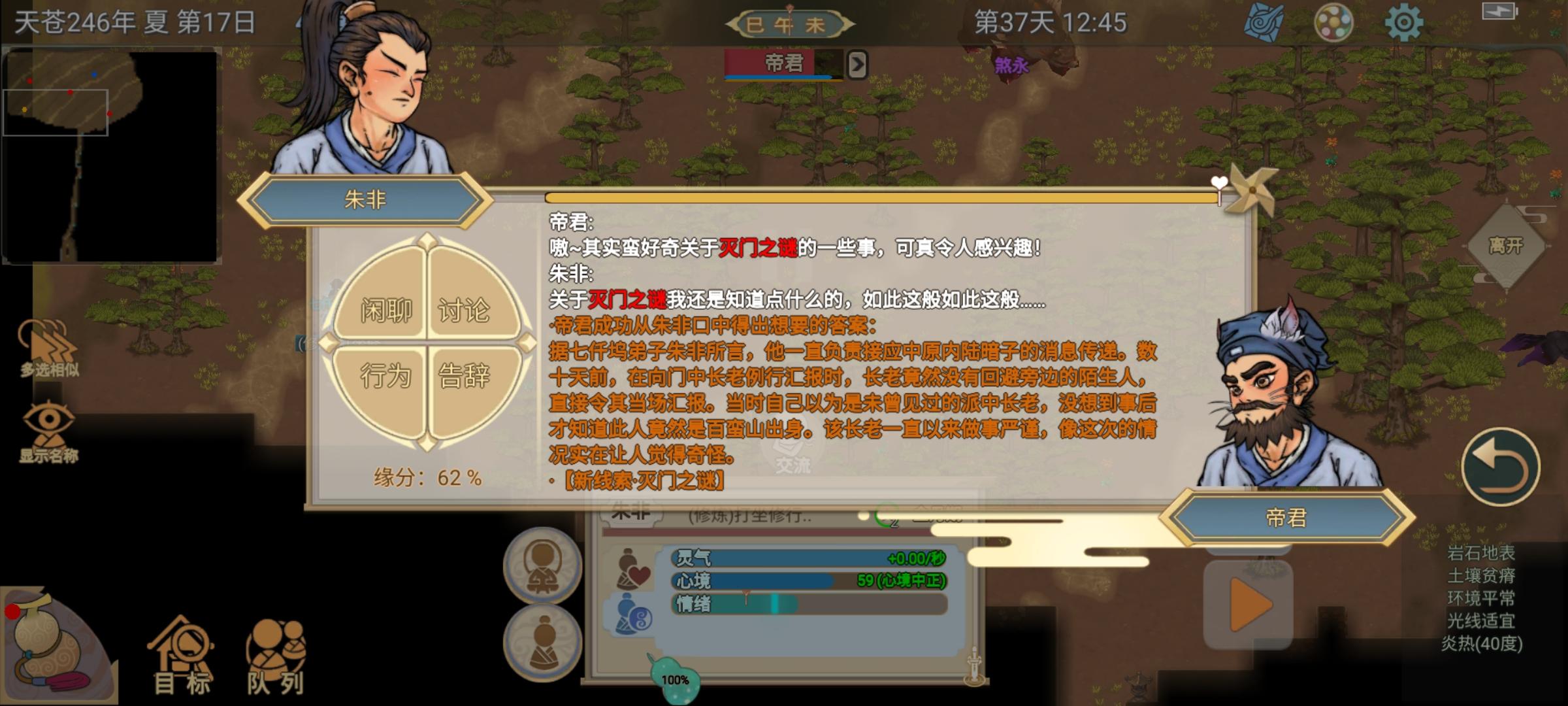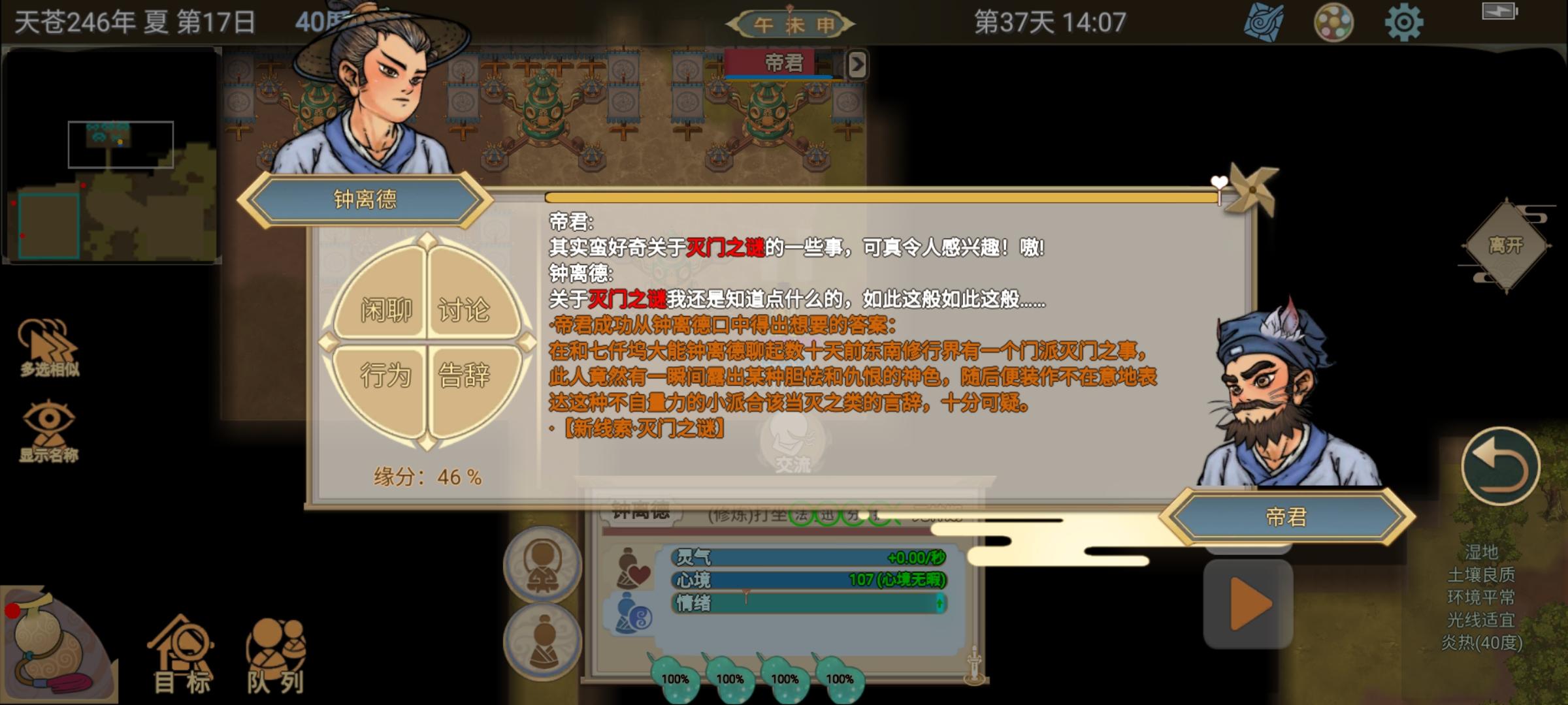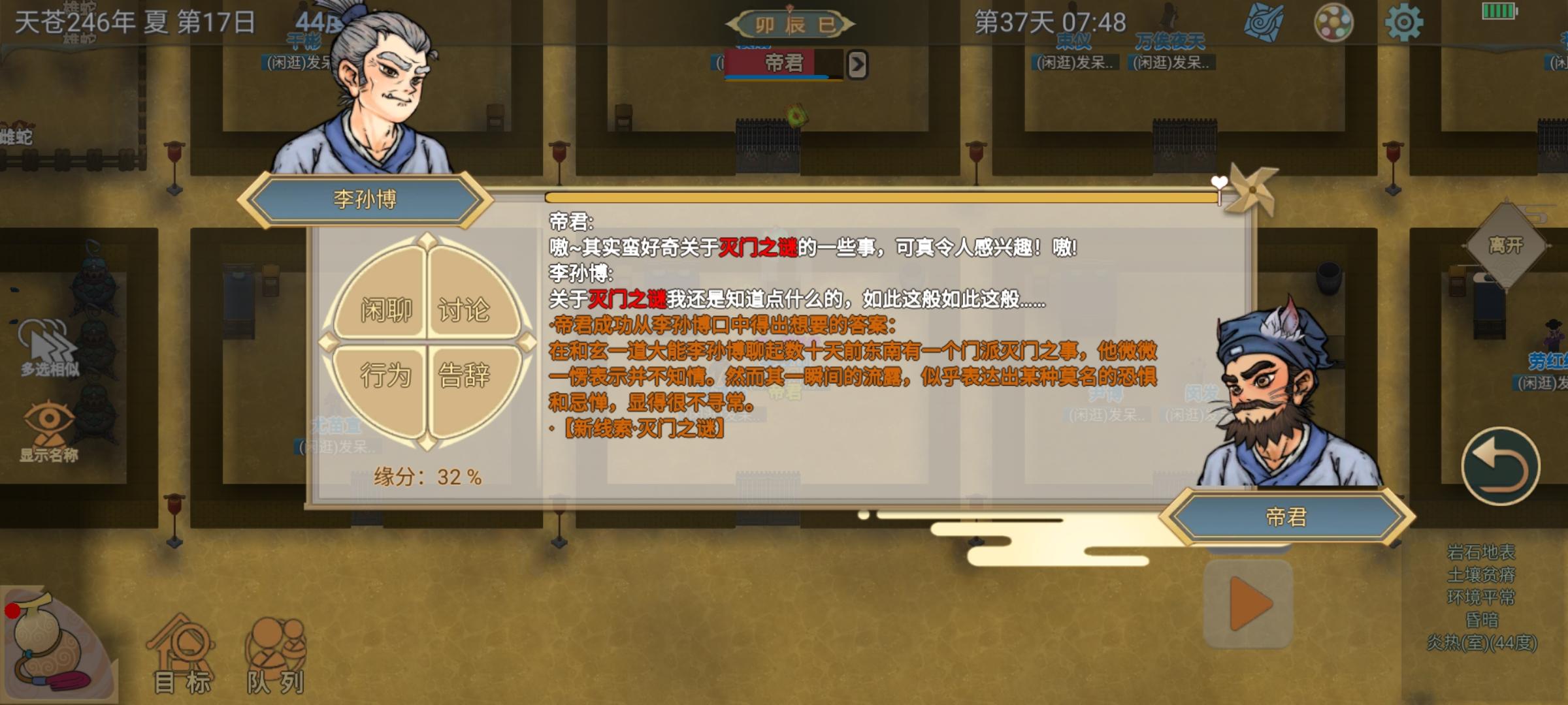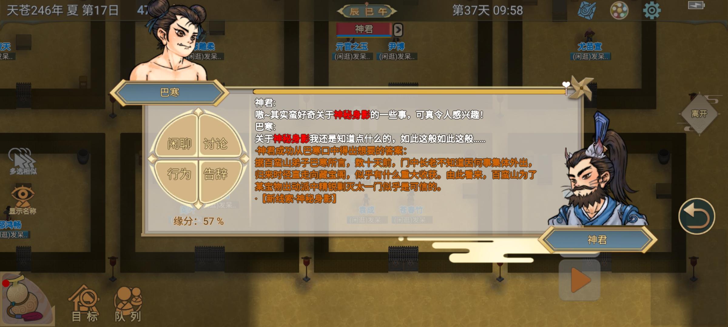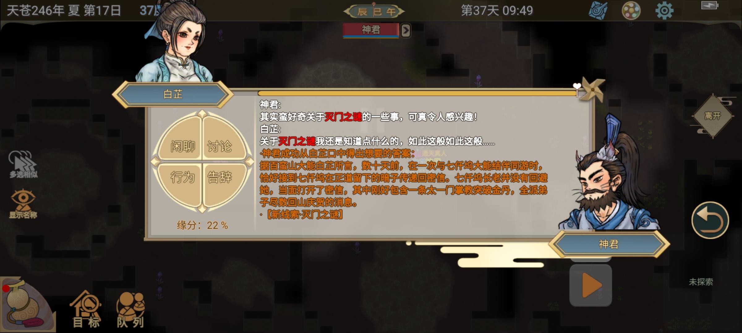 (先问门派元神期大能破心房聊满熟悉渡,再问剧情人物秘闻,如果人物不在门派,就聊行踪,去一个个找)。