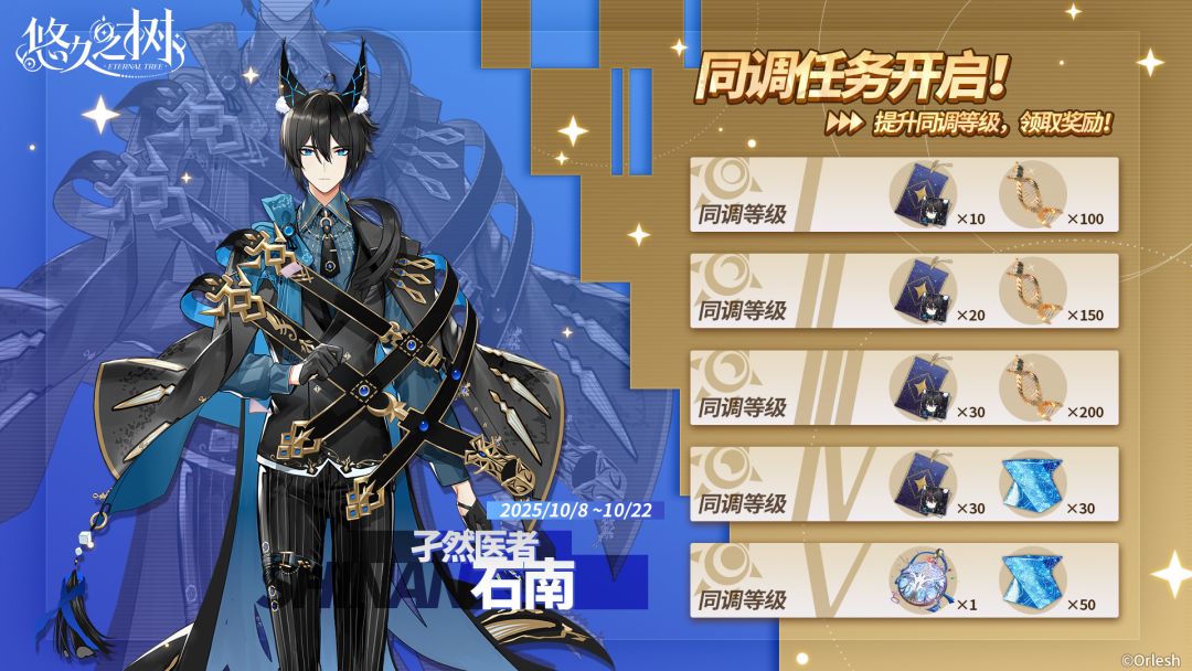 10月8日 维护后 - 10月22日 10:00,提升新角色「孑然医者·石南」的同调等级,即可获取新角色的许愿签等道具奖励!将同调等级提升至4级,总共可获得许愿签·[孑然医者]石南×90。将同调等级提升至5级,可获得银色誓言×1!
