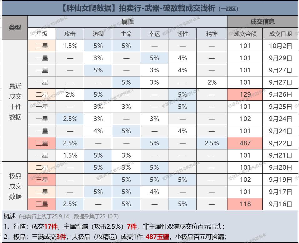 1、行情概览:拍卖行上线24天,一战区破敌戟成交17件,上线时间和开服前两月骑兵版本完美错开导致玩家均有储备,成交量不及蛇杖;其中主属性满(攻击2.5%)7件,不拍攻击属性这个操作,本胖想破头也没参悟到,非主属性双满成交价百元出头即可抱回家;