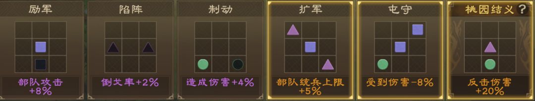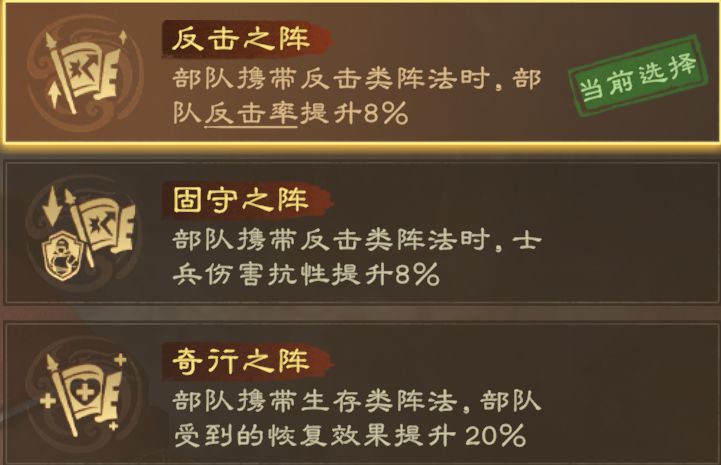 刘备同理,由于一般携带反击类阵法,这里选择“固守之阵”。
