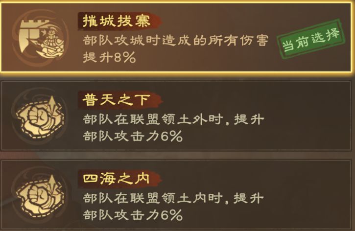 刘备同理,一般选择“悬皮为幔”作为防守车头。野战时可视情况选出另外2个天赋。