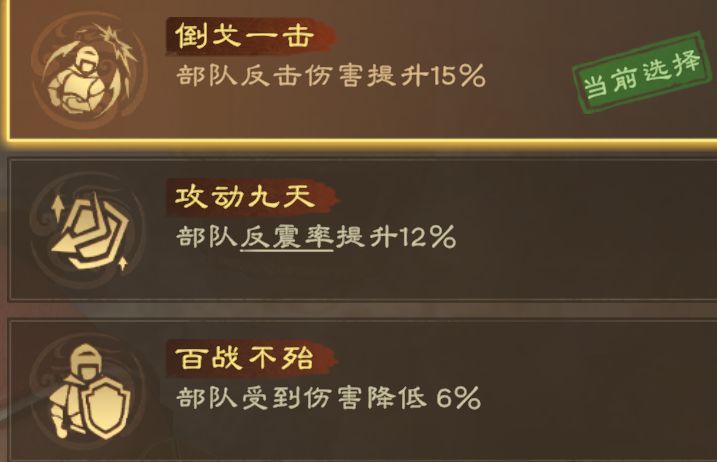 张飞这里选择“倒戈一击”提升反击伤害,或者“百战不殆”降低受伤提高生存能力皆可。