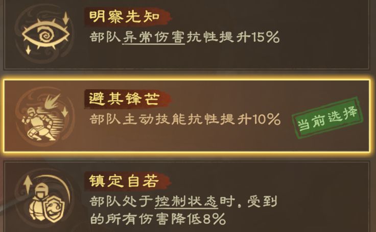 张飞天赋如下,这里一般选择“避其锋芒”,因为当前战场环境控制队和异常队较少。