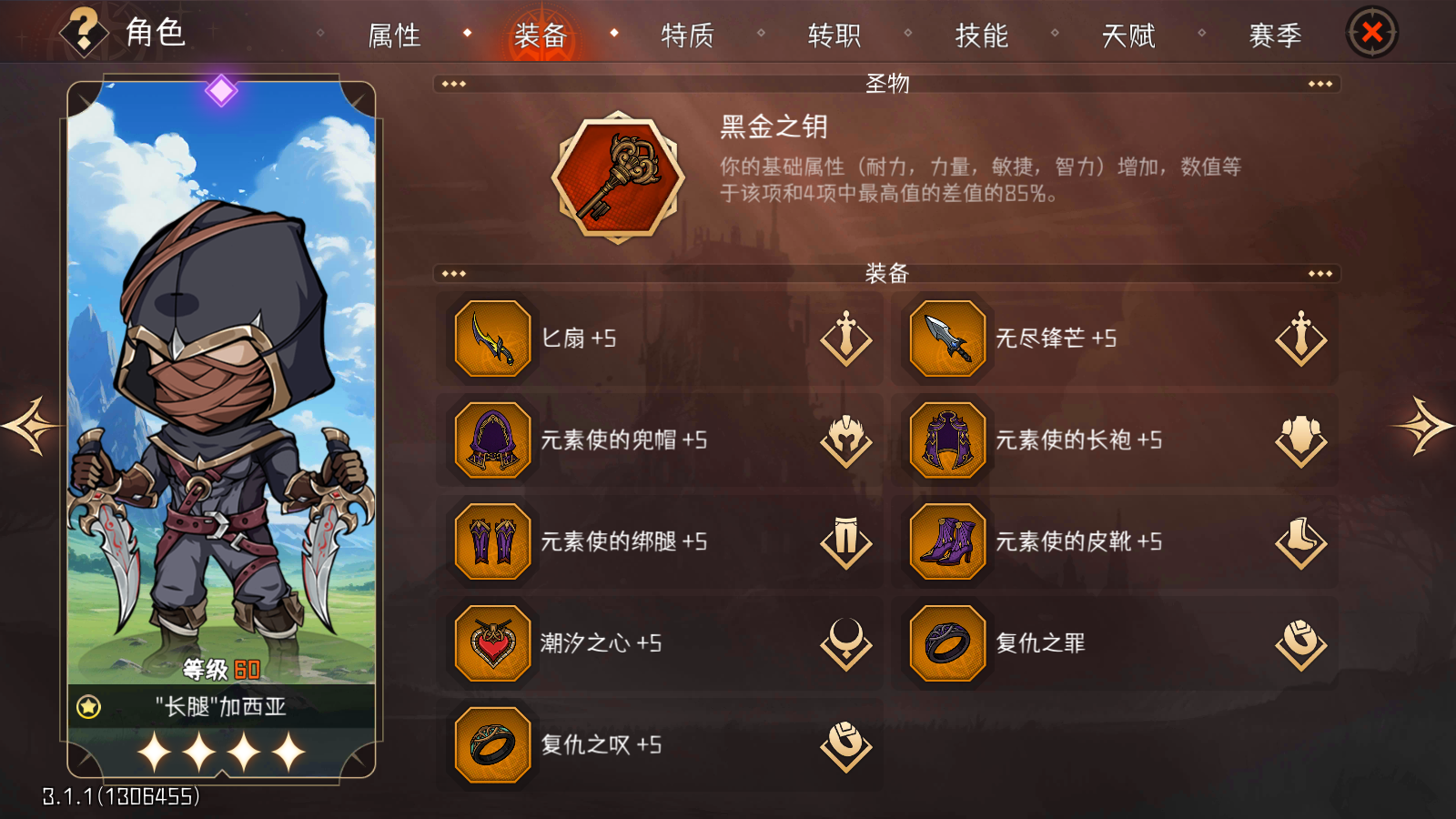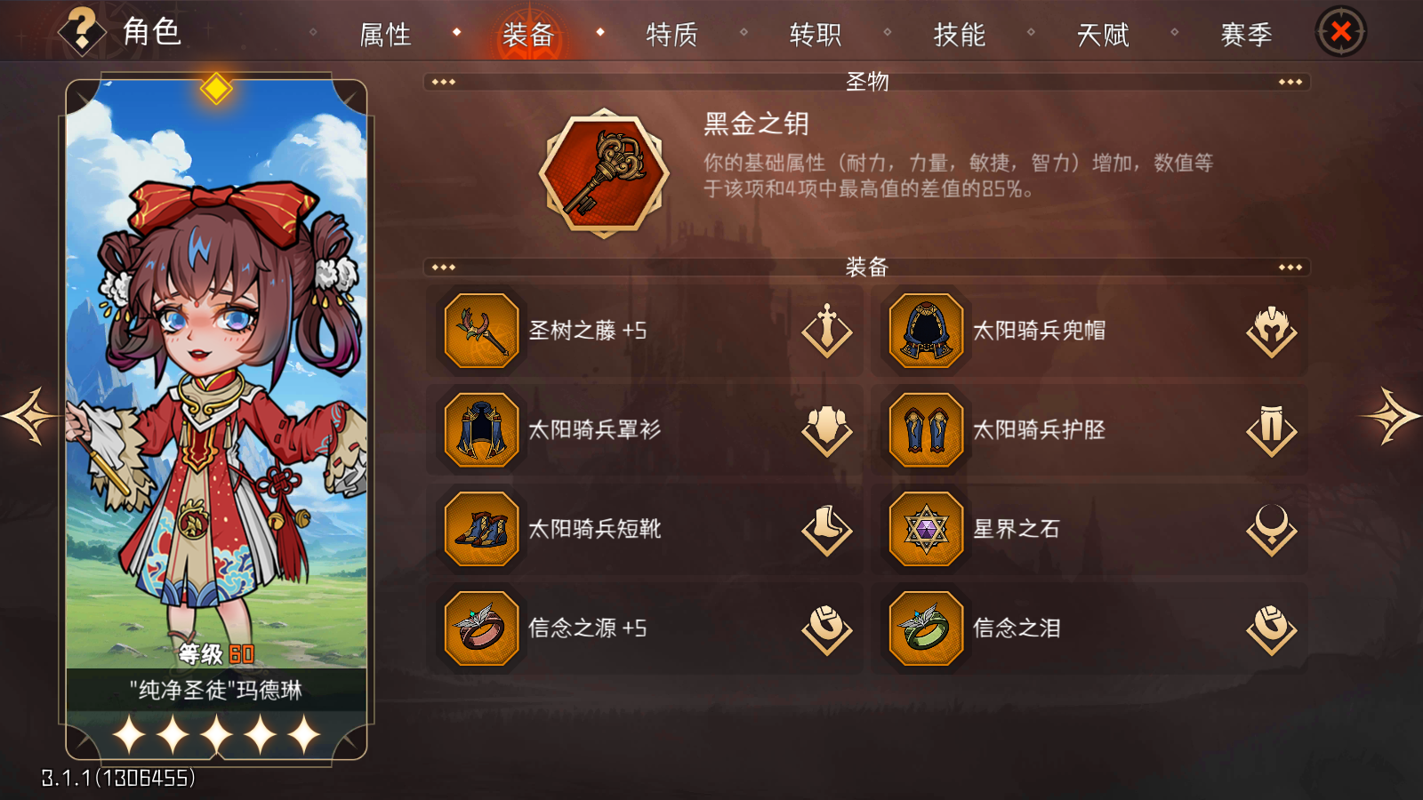 圣物:黑金之钥(提高基础属性,以下也可以选,包括群山之祝、王者决意、荒野之息等)