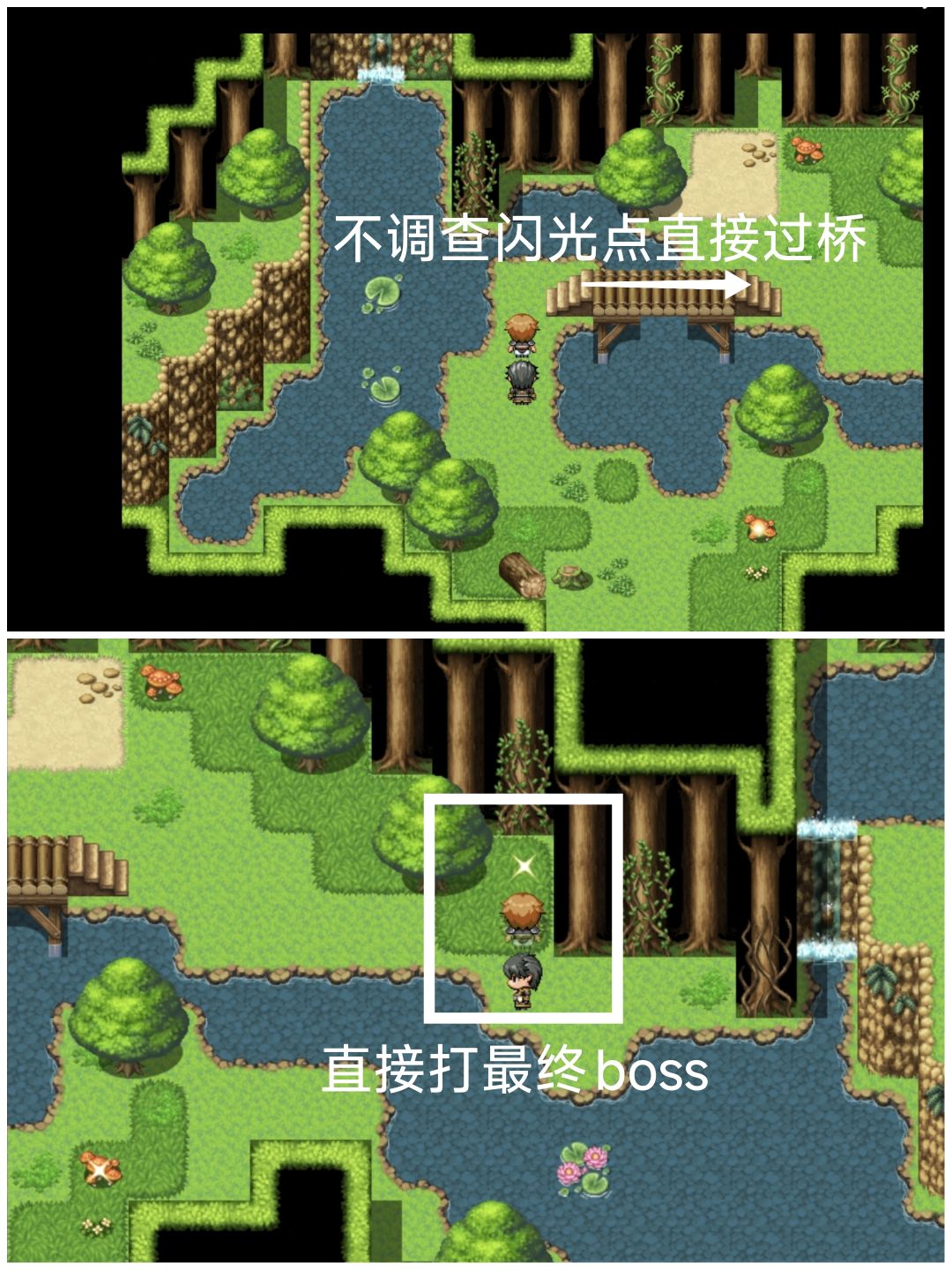 下面的闪光点不调查,直接往上走过桥调查闪光点,可以直接打boss,不影响后续剧情