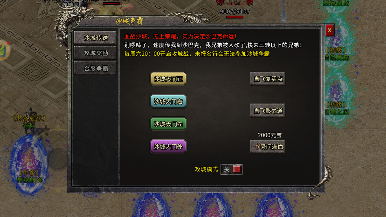 - 参与要求:需由行会会长缴纳报名费,完成缴费后,该行会所有成员方可进入沙巴克皇宫,参与领地争夺;