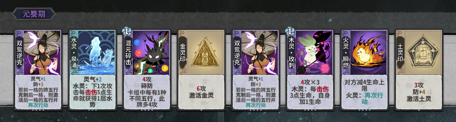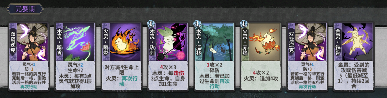 元神在当前版本非常强势,主要得益于刻印能够更快的叠攻和出伤让3动杀变得更容易,在玩金木火的时候除非元婴期烂完得拿牌,不然必点。在玩丹水的时候因为我们不会有任何激活所以拿修为即可。
