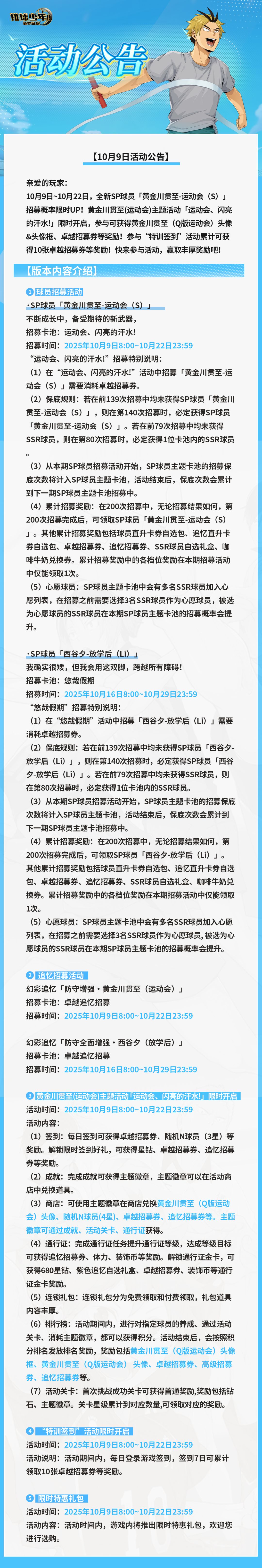 10月9日 ~ 10月22日,全新SP球员「黄金川贯至-运动会(S)」招募概率限时UP!黄金川贯至(运动会)主题活动「运动会、闪亮的汗水!」限时开启,参与可获得黄金川贯至(Q版运动会)头像、卓越招募券等丰厚奖励!