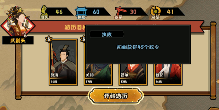 为了能更早的拿到第2个学堂,我们需把开局的执政属性,提升到有40个左右的额外政令,这样就能分到10个额外的探索政令,加上初始的20个、3波流寇和前4波出征给的100个,就有130个探索政令,进行13次探索了。