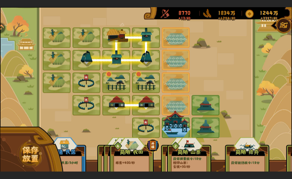 特别是水寨和城关,是保证金钱获取的关键,有了它们之后,我们只需要在关注粮食和兵甲的产量就行了。