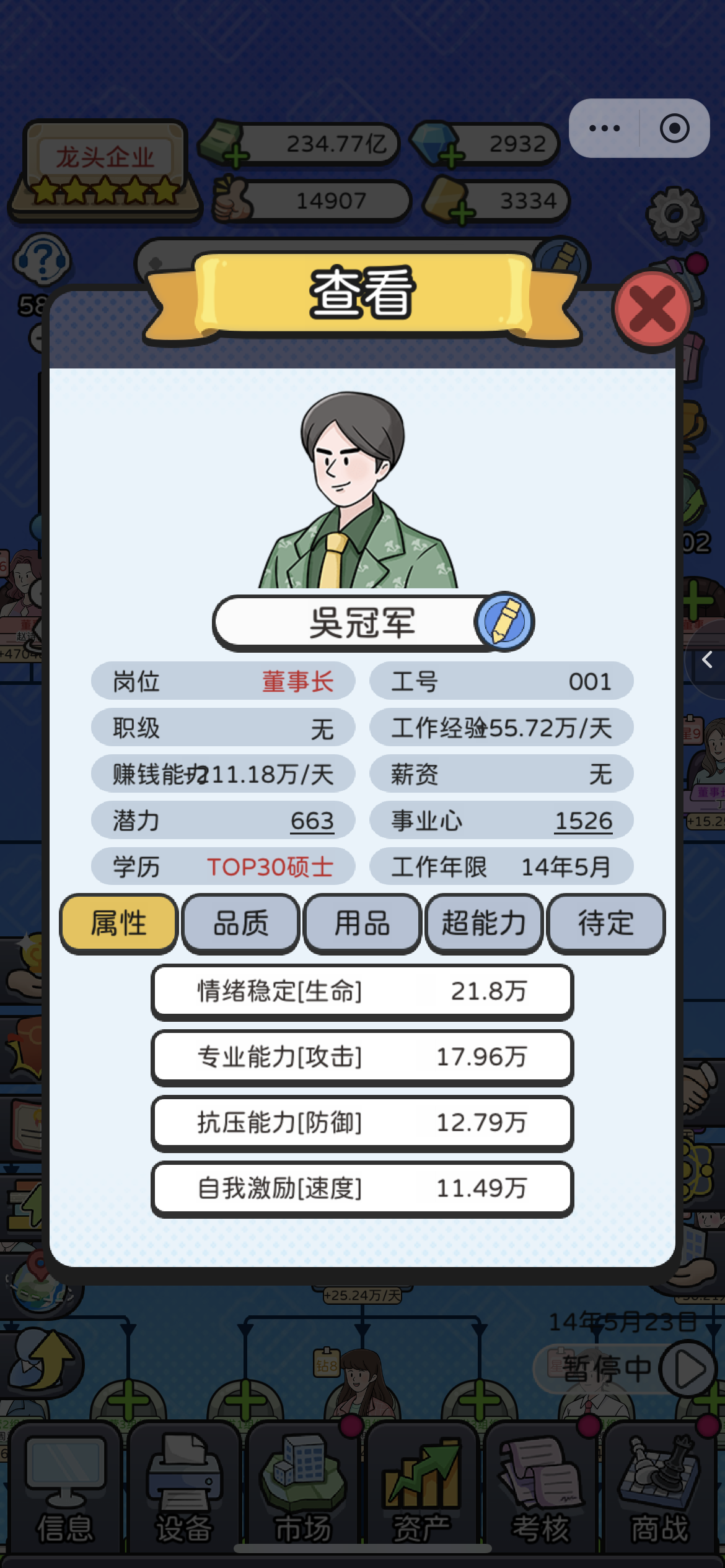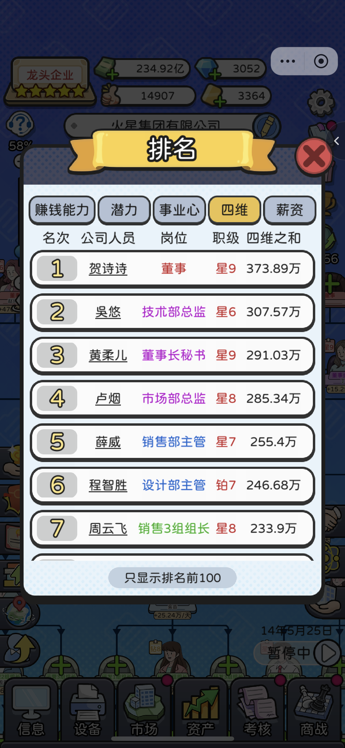 一开始走的广纳人才套路,随着人数增多,每一天的时间增长,如果读书广告少,员工四维增长慢,商战过不去。所以后期裁员,增加每位员工触发各类事件的概率,最终保持在40人左右。