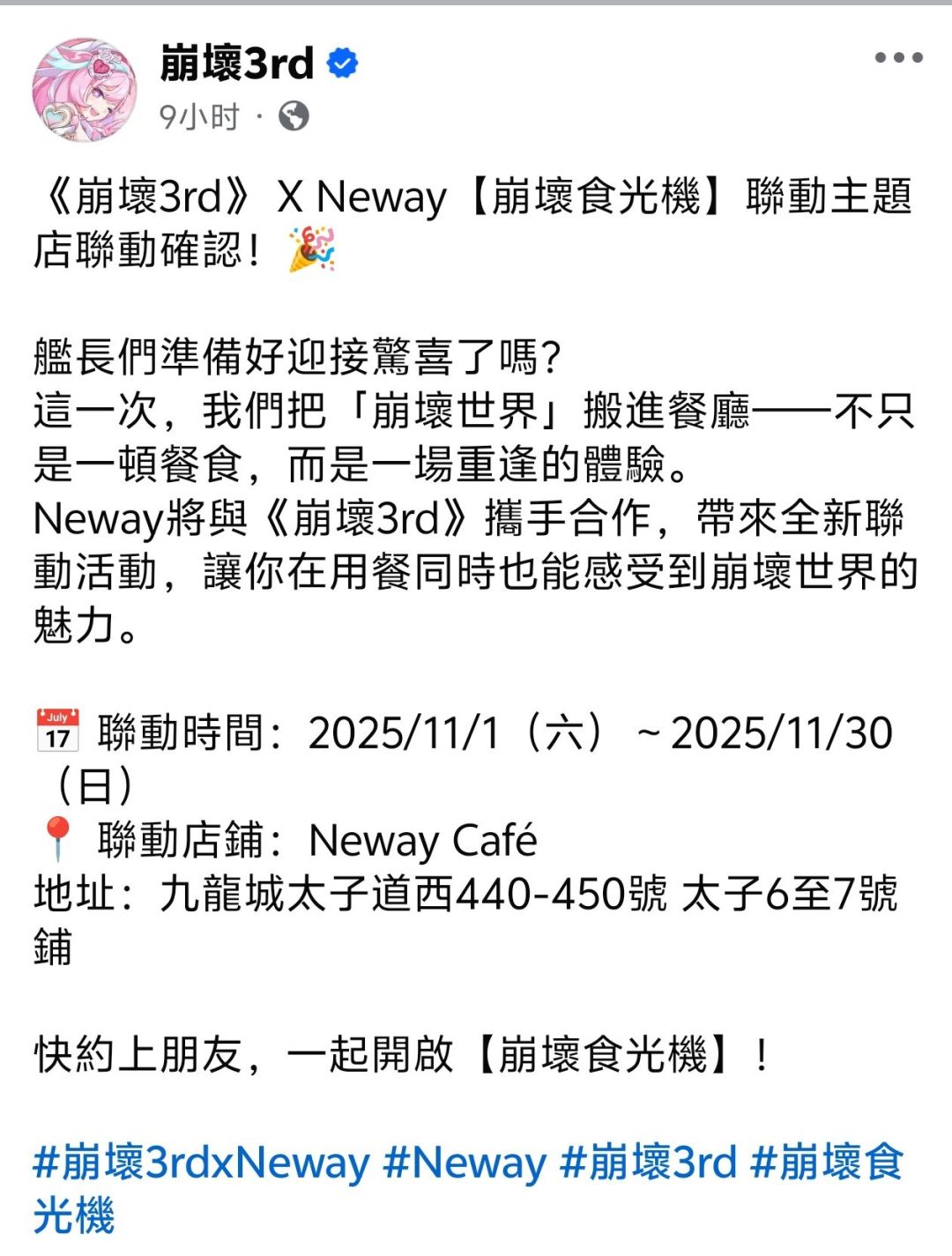 通过与《崩坏3rd》这样的热门游戏 IP 合作,Neway 不仅向年轻族群和游戏文化靠拢,也为旗下餐饮业务注入了新的活力,展现了其在娱乐市场中的创新精神。