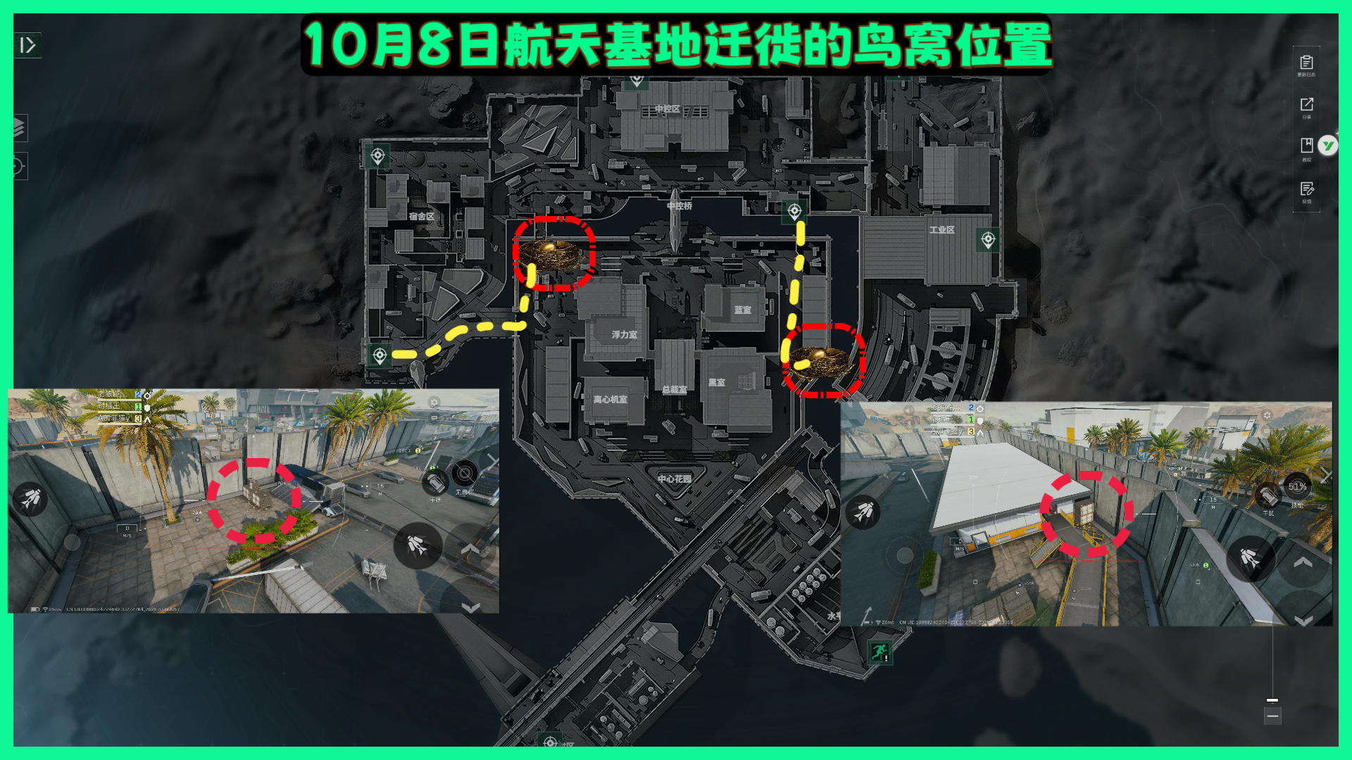 航天基地一共有2个点位,图片从左到右位置依次在:一号员工通道南边门口货箱上面和黑室东侧最外面铁桥和平房交界处货箱周围。需要注意的是:这两个鸟窝的位置1号位都是需要刷卡才能最快到达,具体位置参考图片即可~