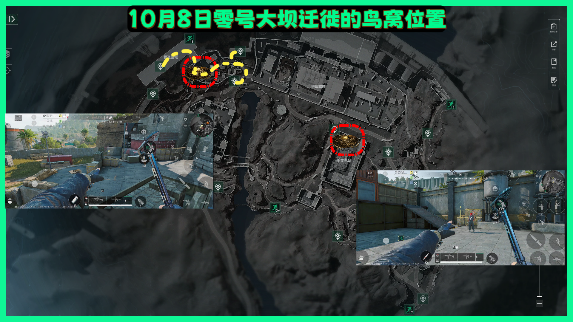 零号大坝一共有2个点位,图片从左到右位置依次在:地图左上角军营房间对面空地角落和主变电站西北角的黄色粮箱上,具体位置参考图片即可~