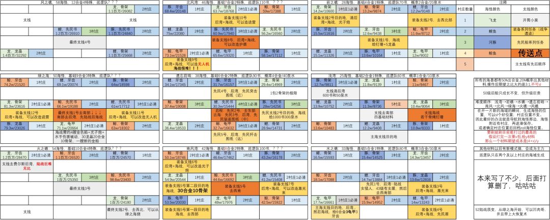 遗忘前哨一开始不显示村庄(早期七海的海狗湾也是这样),因此探村庄应该以前往(50,50)、(50,150)、(150,50)、(150,150)四个点(也就是走正方形的路线),当海兽在任意一个村庄附近时(如果不需要打这个海兽,那无所谓,但材料后面肯定要刷的,以防万一),就进村庄存档,否则应该用脑子记住村庄大致位置,然后退出游戏重新进入该海域,刷新传说海兽的位置到村庄附近。村庄是不会随机位置的。
