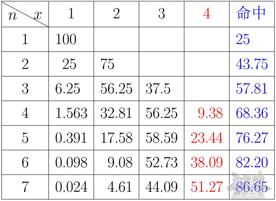让我们来算一算 n (n=1~7) 张牌中有 x (x=1~4) 种花色的概率分布