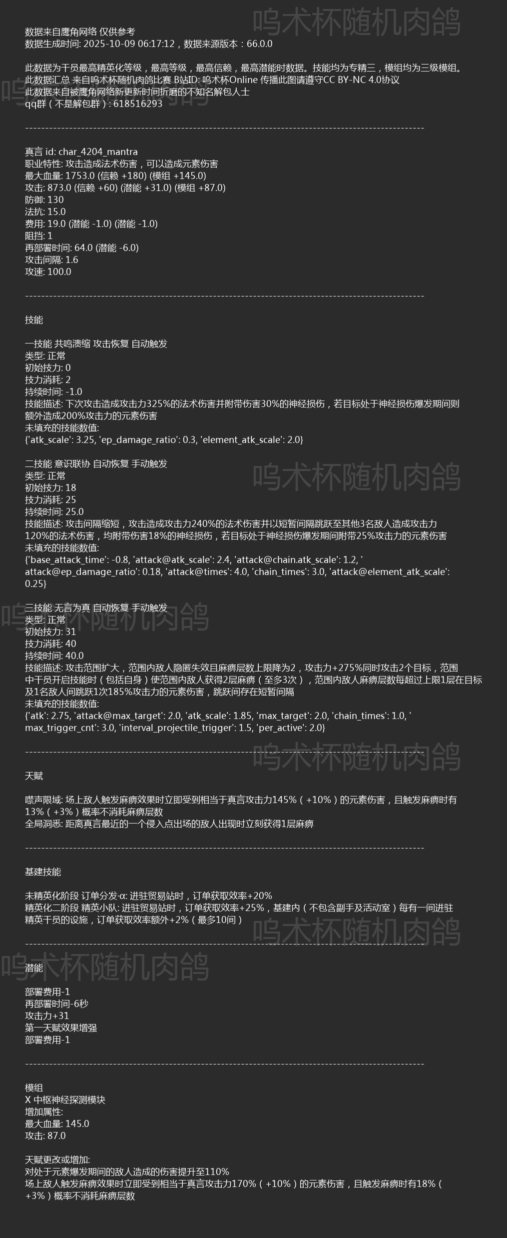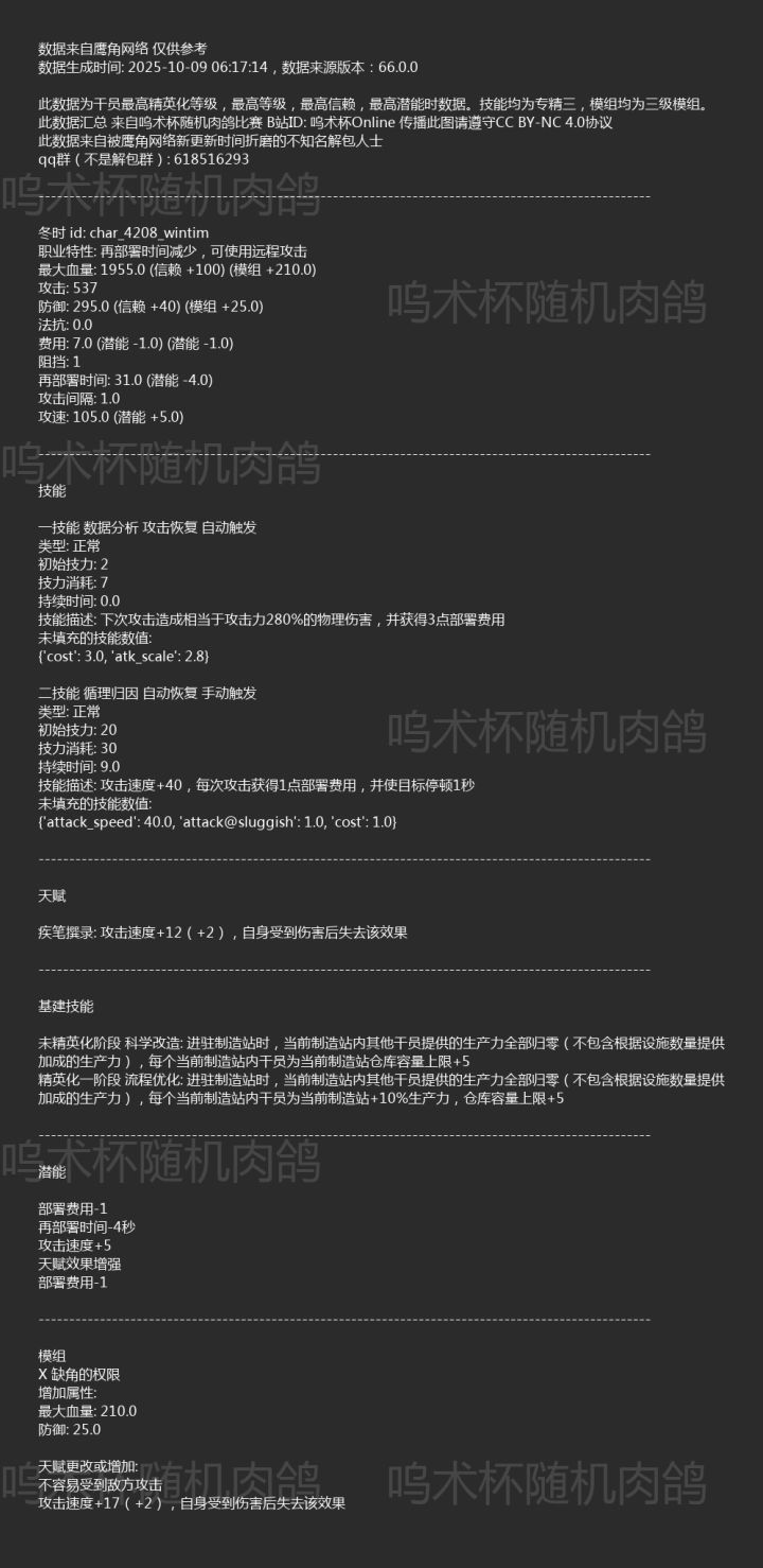 冬时1技能7技力回3费有点拉了……有模组满潜+17攻速。2技能+40攻速停顿1秒。初动10秒持续9秒。