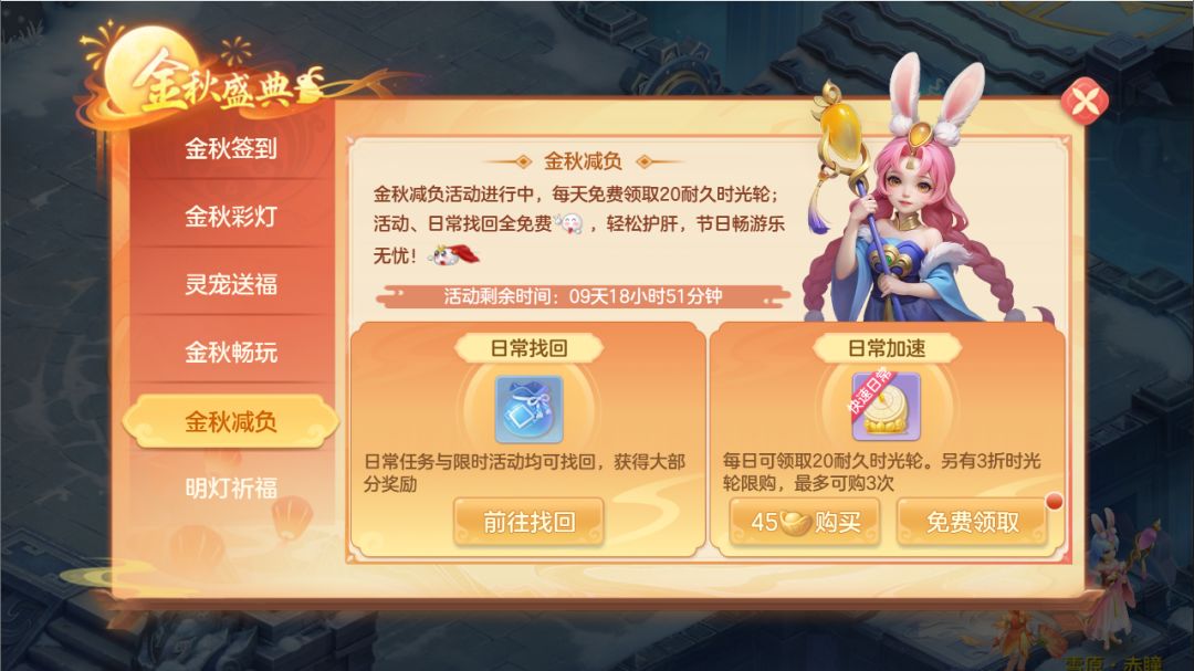 【金秋减负】将开放至10月15日。长假期间未登录的少侠也无需担心,可以免费找回日常和限时活动的大部分奖励,助你轻松追赶进度,无惧掉队!