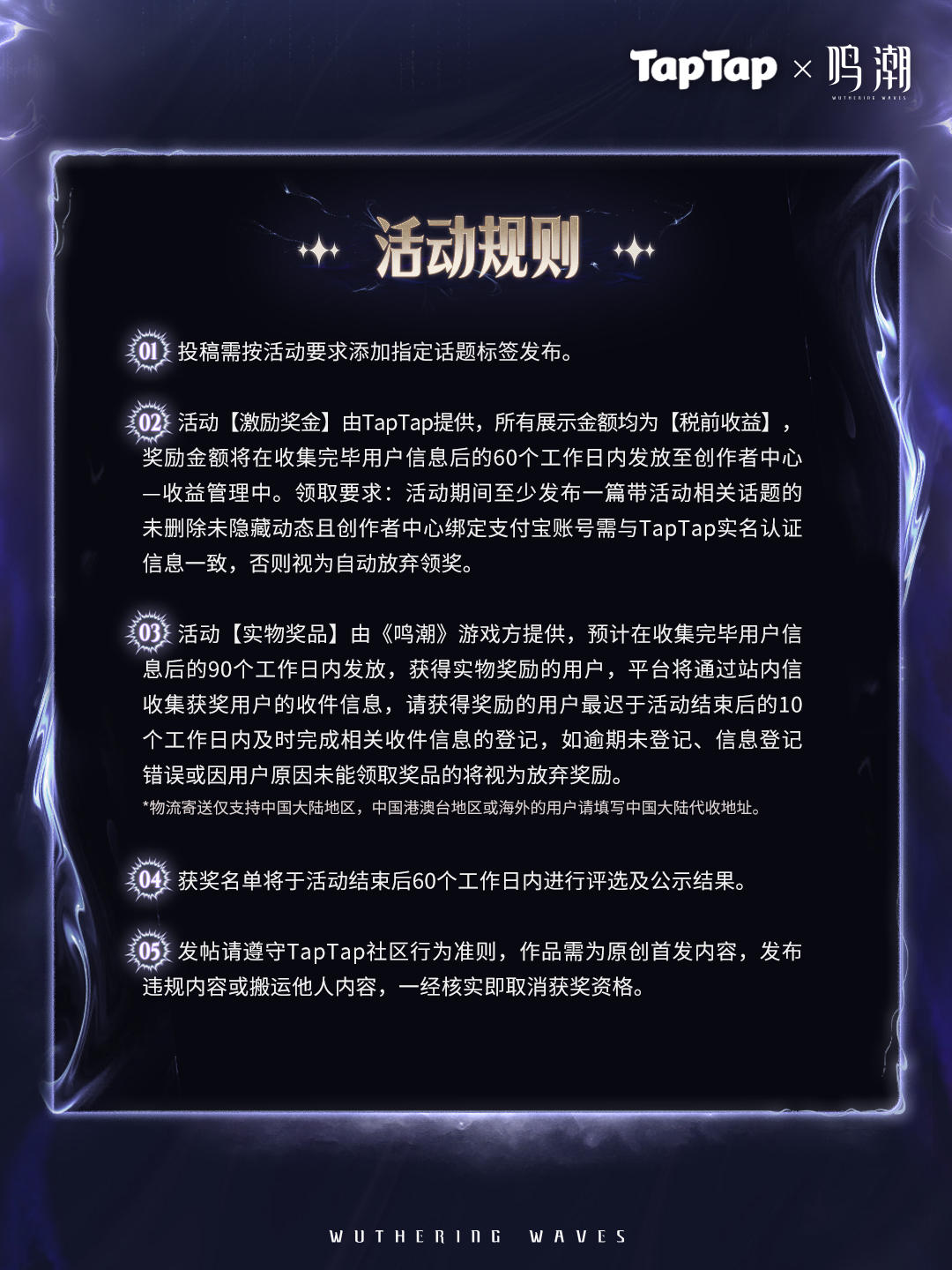 本次征集活动需要以《鸣潮》2.7版本为主题,包括但不限于角色、活动玩法等内容进行创作,并在《鸣潮》版区内选择话题标签 #鸣潮创作激励
