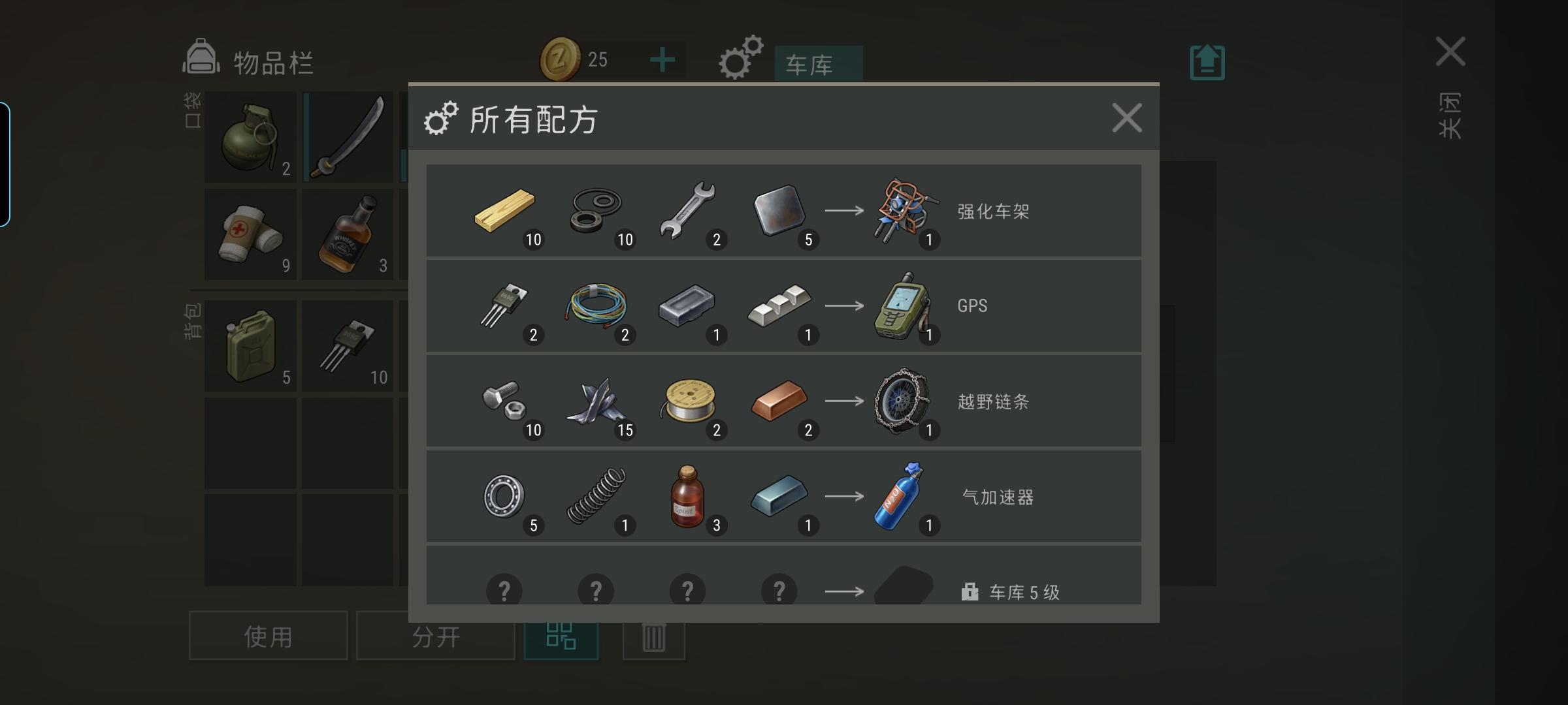 一、自家车库合成的GPS,在新图使用后图中问号会显示颜色,绿色是药品,黄色食物,紫色工具。