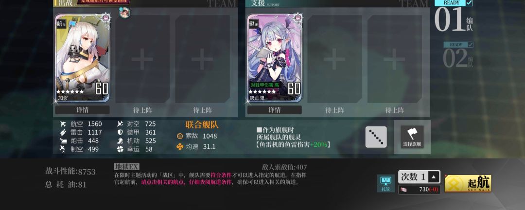 这里带吸血鬼是考虑到万一航母输出不够拖进a点夜战时可以靠吸血鬼补伤害过。由于航母在前排基本可以无视关卡内的拉古兹飞机。鱼雷航母如加贺、埃塞克斯等非常克制重甲BOSS,练度要求较宽松。