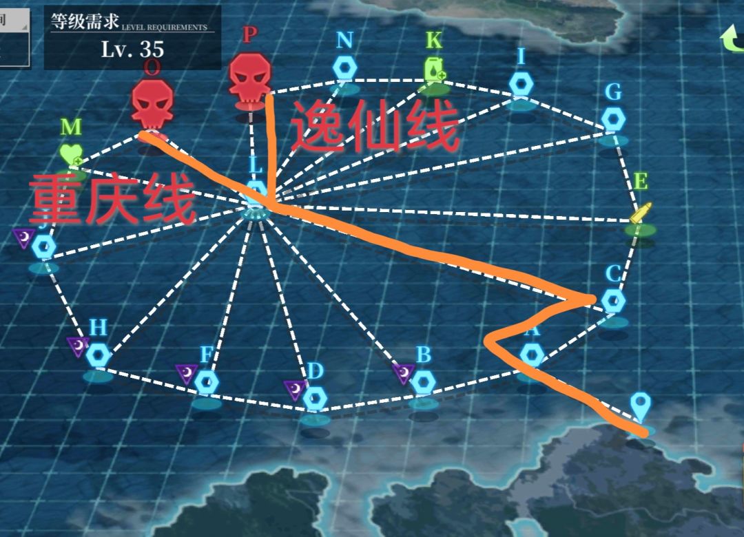 带路条件:凤棲船<2,航母≥7,旗舰为轻巡时为重庆线,旗舰不为轻巡时为逸仙线。
