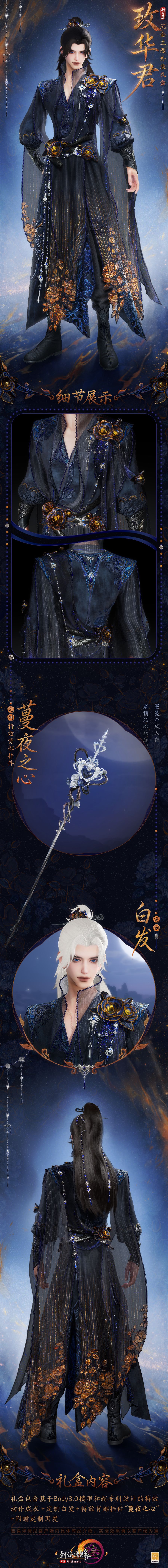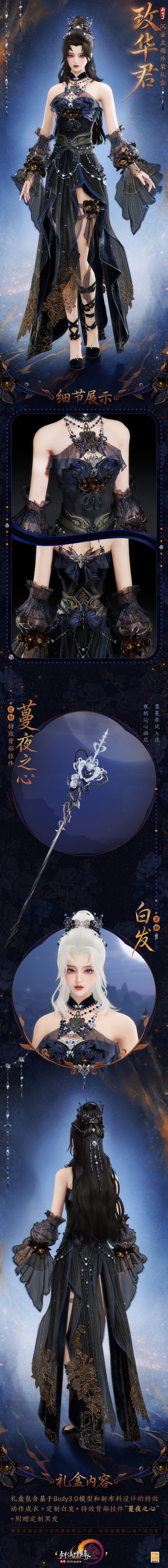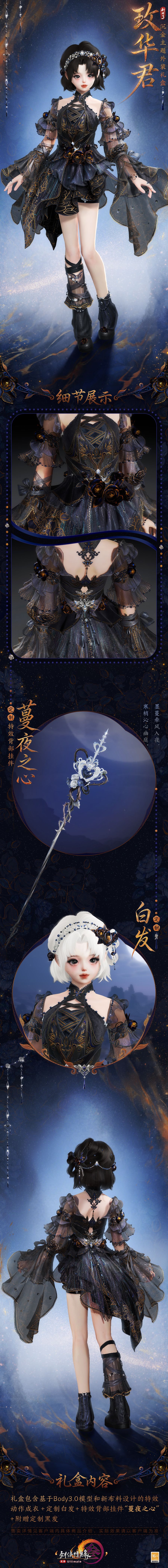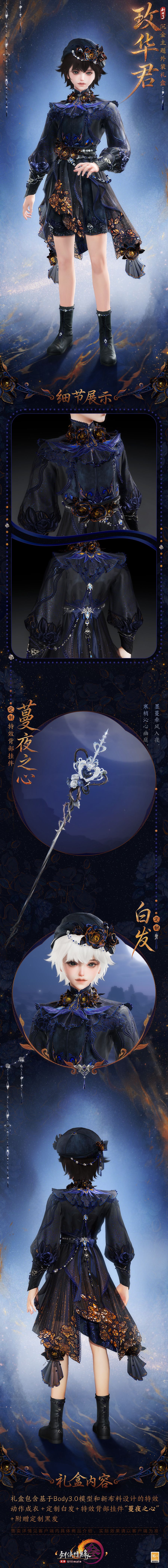 暗夜凝香,矜华破夜,沉金主题外装礼盒“玫华君”华丽亮相!暗金花影自衣裾蜿蜒而上,蓝黑丝绒层层晕染午夜深空,将幽夜诡谲与流光璀璨熔铸一体,点点荧光漾开冷寂光晕,夜岚流转,星斗骤现,神秘凛然。