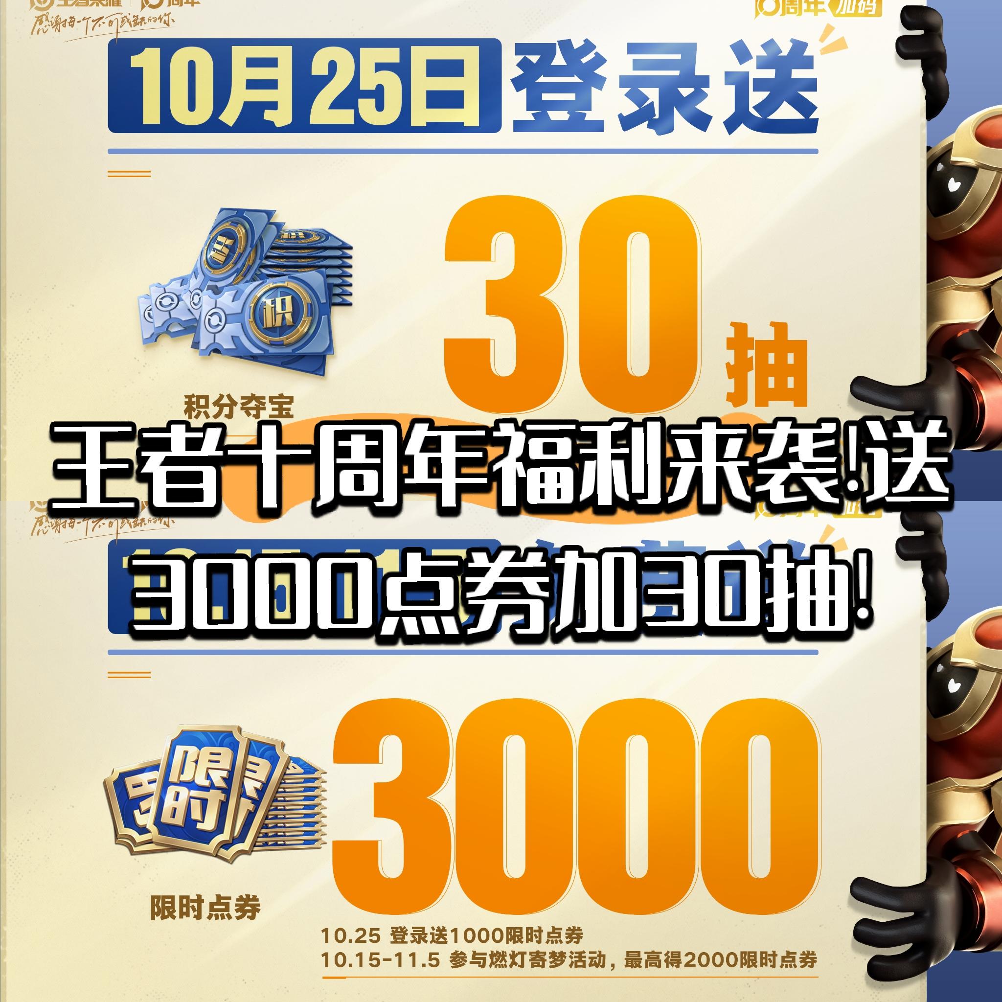 《王者荣耀》十周年庆典将于10月25日正式开启!此次十周年王者荣耀官方为玩家准备了史无前例的福利,包括3000限时点券、30张积分夺宝券、多款免费皮肤及稀有资源,可以说是非常良心的一次周年庆典了