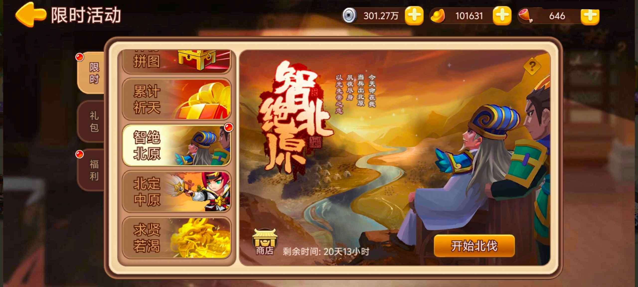 活动内容:活动期间参与北伐活动,击败来袭的敌人,获取粮草可在商店兑换武将及月光套装。