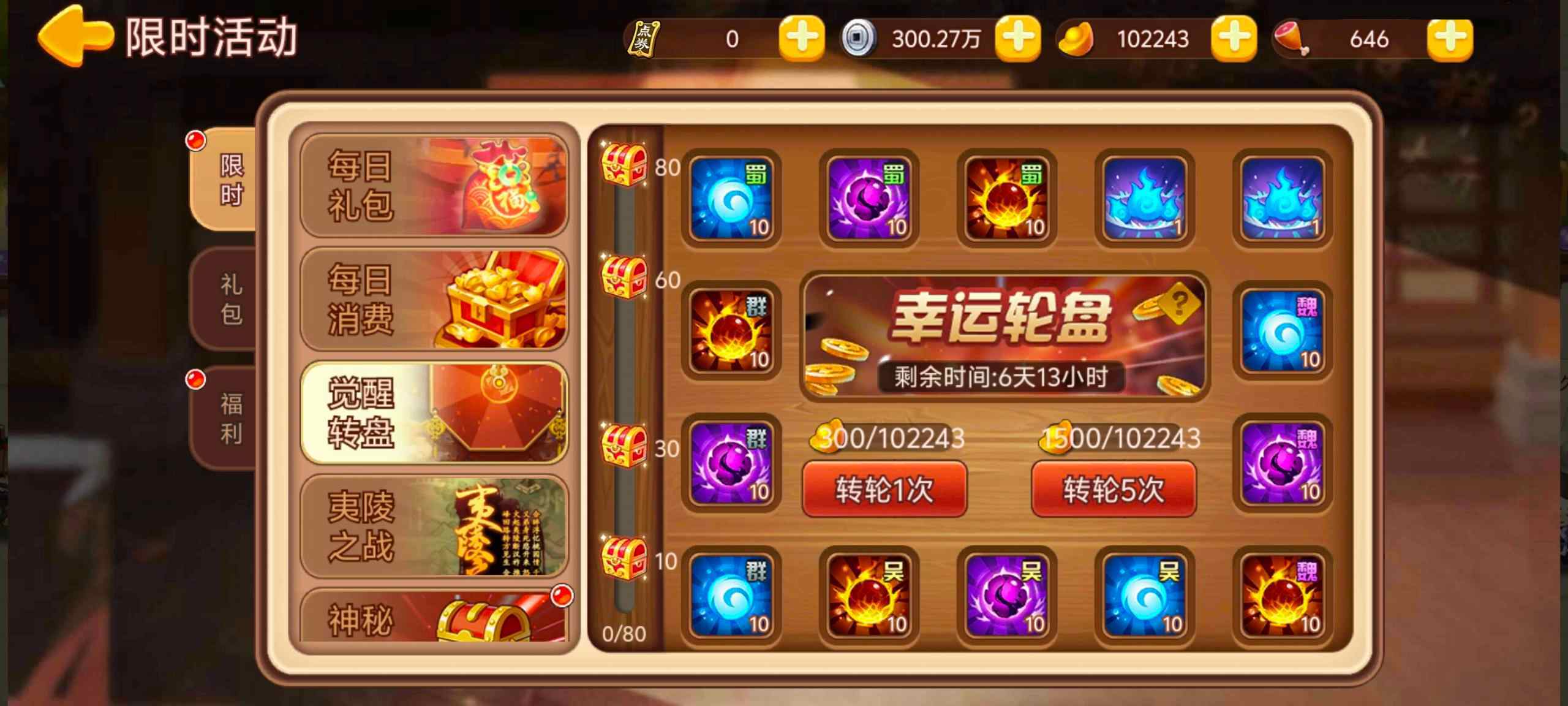 活动内容:活动期间可消耗元宝转动转盘获取武将觉醒材料,累积转盘次数可额外领取武将元神和精华奖励。