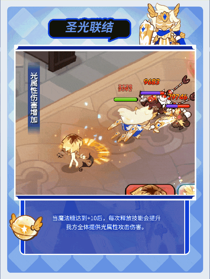 获得光之力量强化自身,普通攻击造成额外伤害,且每攻击一定次数后发射更为强大的光之力量攻击敌方,并恢复自身生命值,技能结束后,自身获得生命值护盾。