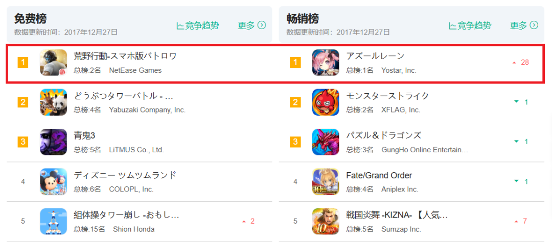 与此同时,以《荒野行动》《碧蓝航线》为代表的中国手游,也在日本市场取得了开创性的成绩。