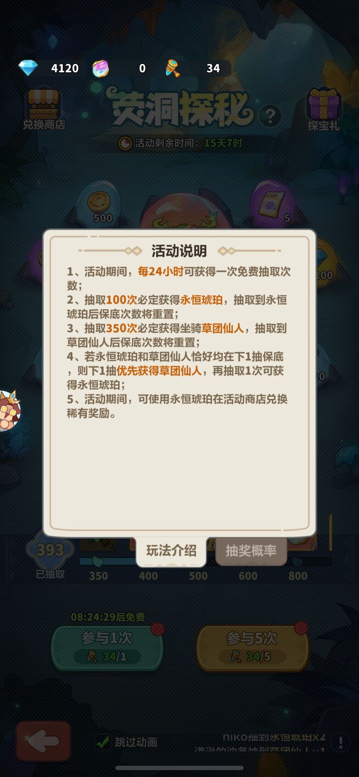 • 荧洞探秘:在古树秘宝开启一周后解锁,是一个抽奖活动,可使用流光稿进行抽奖,流光稿可通过完成任务获得,也可以用钻石抽奖,300钻石抽5次。每抽100次保底获得一个永恒琥珀,350抽保底获得坐骑草团仙人。永恒琥珀可用于兑换稀有道具,如武器皮肤等。建议玩家提前准备好流光稿,在活动开启后根据自己的需求和资源情况进行抽奖。