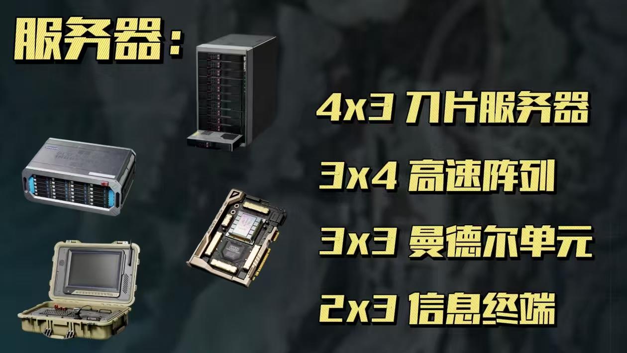 饱受大家喜爱的刀片服务器也是可以直接在搜索服务器中直接能预知到,当我们遇到4*3的格子布局时就证明出货;除此之外我们在搜索服务器时看到3*4的物资就代表着高速阵列将要收入自己囊中了,3*3的格子布局就对应着曼德尔口算单元,2*3就是信息终端。