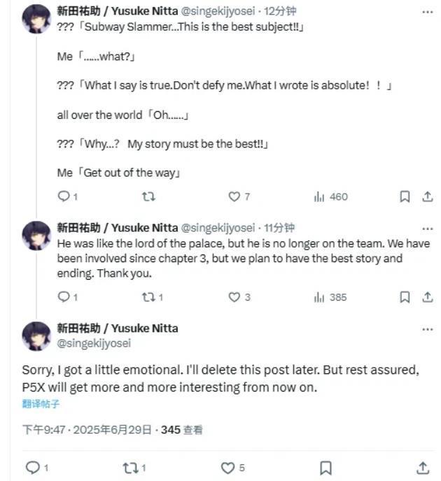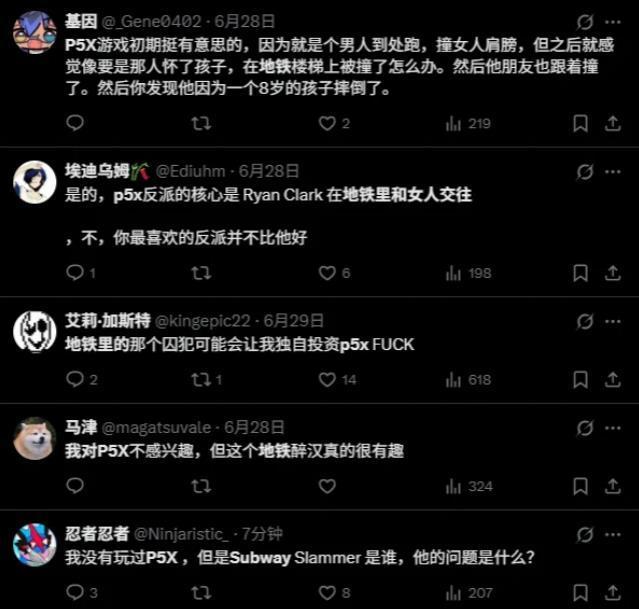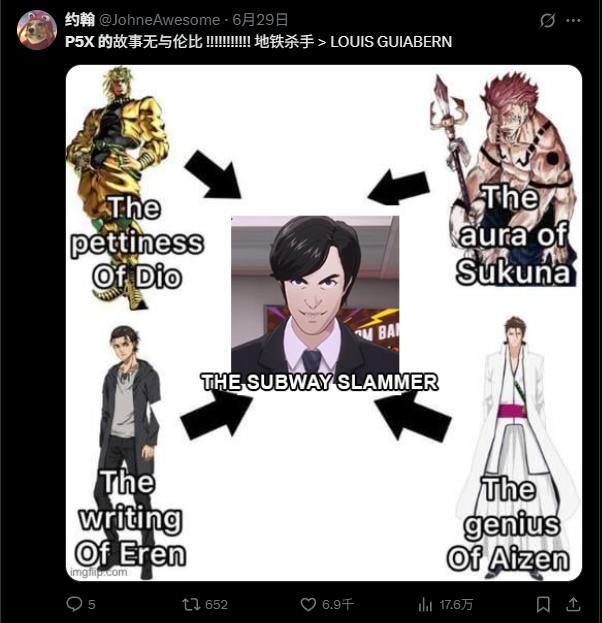 P5X的现任编剧新田在看到subway slammer大热后发表了一些想法。全是对前任写出“肘击boss”的怨念。前任编剧「地铁肘击……这可是最棒的题材啊!!」新田:「……啥?」前任编剧「我说的就是对的,别反驳我,我写的就是绝对的!!」全世界(玩家?):「哦……」(表示失望)前任编剧「为什么啊……明明我写的才应该是最棒的!」新田:「让一让好吗。」新田“他以前就像是“宫殿主”,但现在已经不在团队里了。”新田“我们从第三章开始参与剧情创作,目标是做出最精彩的故事和结局。非常感谢。抱歉,我刚才有些激动。这条推文之后我可能会删掉。不过请放心,P5X之后的剧情只会越来越有趣”P5X也的确在第三章后剧情明显好转,由于第一章剧情存在一些不足,在上线时遭遇了一定程度的遇冷。而这一章中木内雄之的荒诞剧情,更是成为了玩家们吐槽的焦点,被视为游戏的一个“黑点”。现在木内的肘击梗算是有点黑红的搞笑色彩。