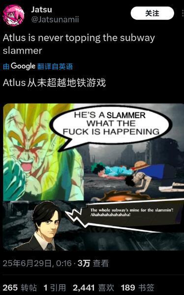 因为出圈,导致很多不玩P5X的都在问这个subway slammer是谁?不过梗出圈是一回事,游戏上线后日本和欧美差评如潮是另一回事,大部分玩家都在吐槽游戏的gacha(抽卡)机制,看起来很多人似乎还没接触过这类手游玩法。目前PX5在日服免费榜第一,畅销榜第十,二流水平的手游吧,也算是超出很多玩家的预期了。希望世嘉好好运营吧。
