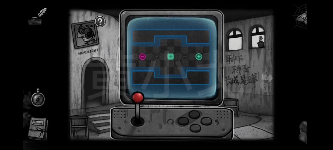 17.点击信箱上的密码锁,根据两个[走廊]、[机器]和[滑梯]场景画的位置及上面的符号线索,完成小游戏