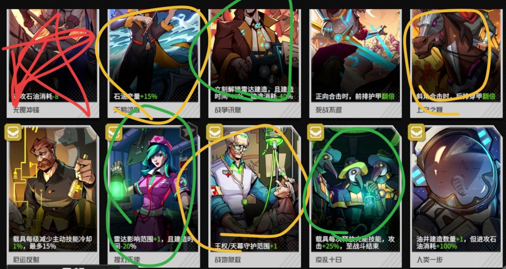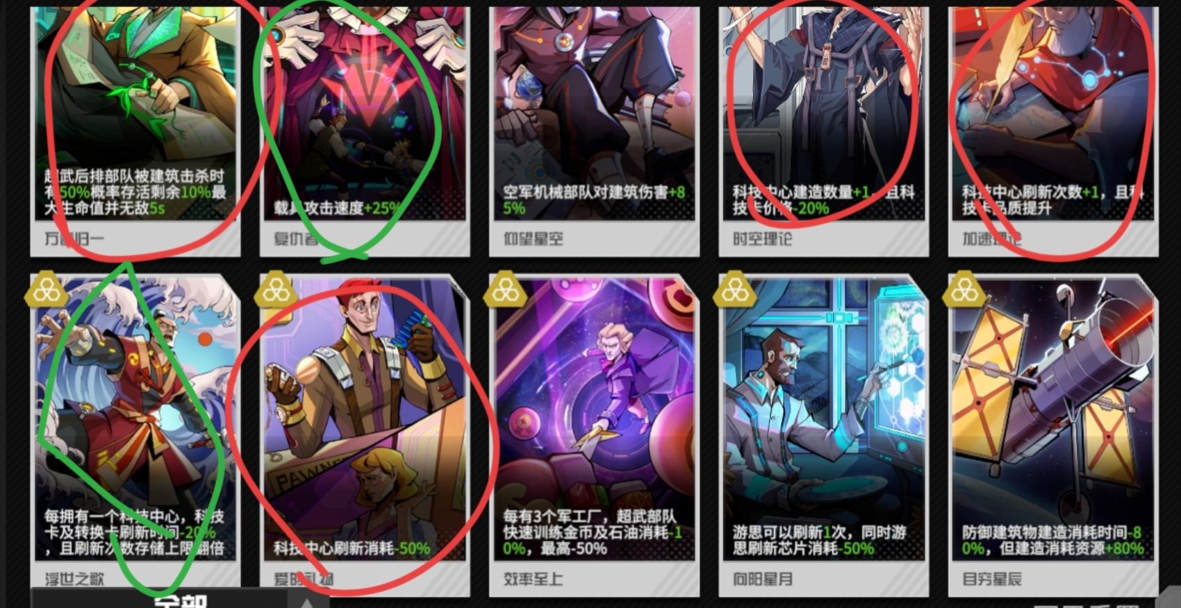 红色是流派核心卡,缺一张都会导致你的部队成为路边,出必拿。除了刷科技的三张卡你还可以赌一赌运气,其他的少一张你都可以老实睡觉去了
