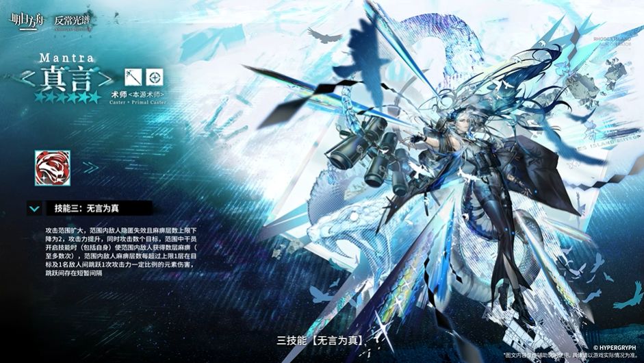 官方披露,真言定位为六星本源术师,核心属性为法伤输出,兼具输出与控场能力。其立绘呈现出鲜明的老年学者特质:头发花白蓬松,眼角布满岁月痕迹,手持记录数据的便携石板,神态沉稳专注,尽显资深研究人员的专业气场。作为系列中罕见的老年形态六星干员,真言打破了以往主流六星角色偏向年轻化、美型化的形象惯性,为角色谱系注入多元活力。