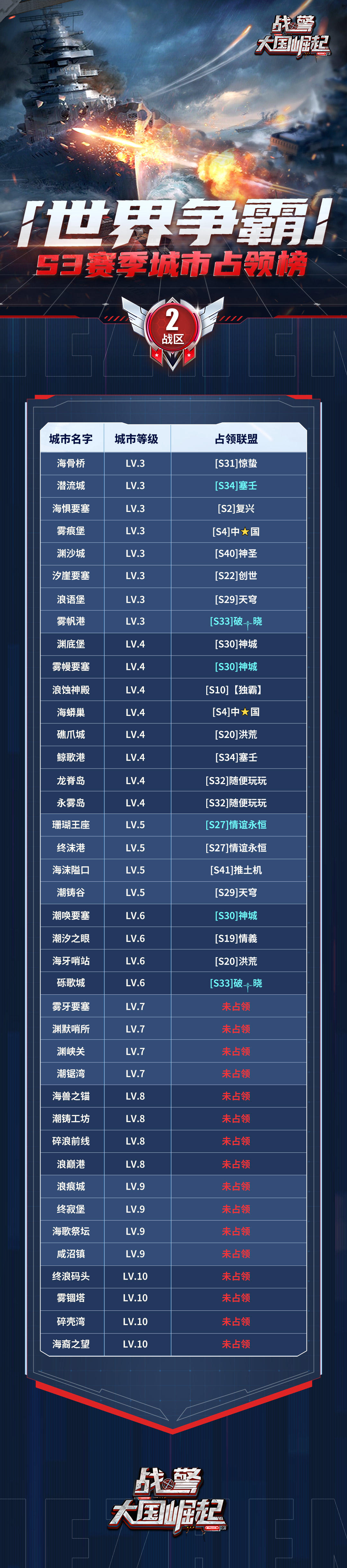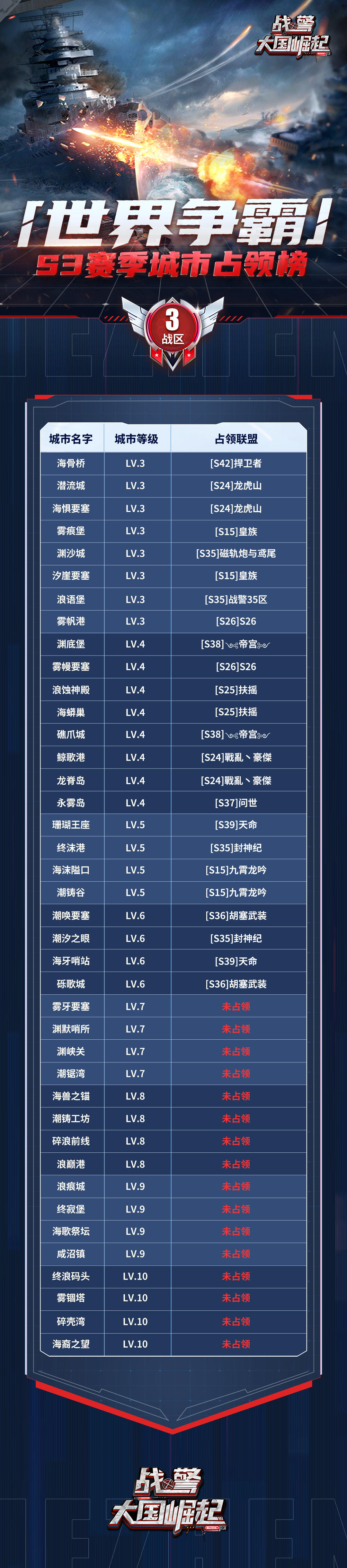 【海上速报】S3赛季首两周世界争霸城市占领榜