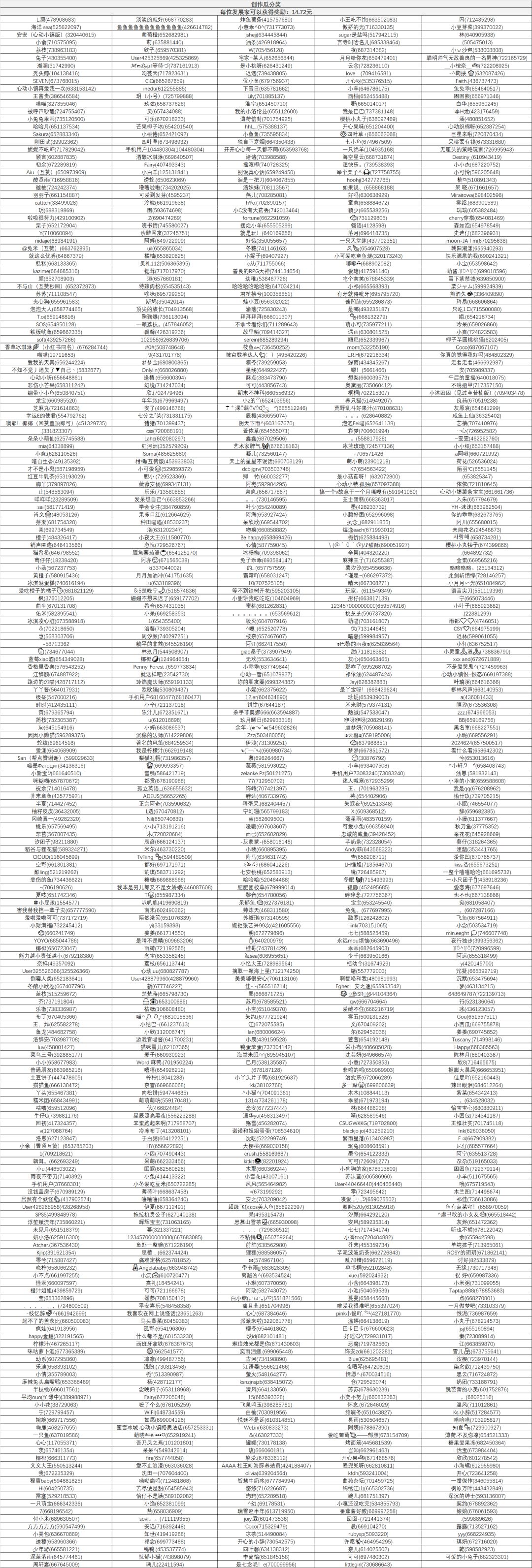 创作瓜分奖获得玩家,目前统计发布合格稿件玩家1019人,每位玩家获得14.72元瓜分奖励:
