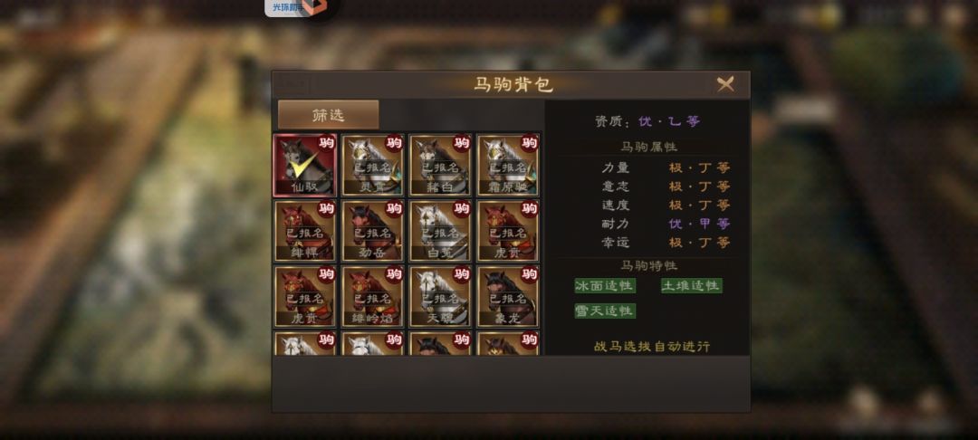 2.军马场:军马场是第一重要的,可以大幅提升马驹概率和属性。它的官员能力是运气,运气越高效果提升越大,这里刘备初始100的运气是卫冕之王。我的军马场是10星刘备+8个5星刘备,然后吃满了30果子+10点运气。刘备这角色10星可用,12星的怒气+20%伤害对于打桩来说用处不大,因为夏侯之类的多段攻击只有第一段伤害有效,完全体要满星满神兵,对于低氪/不打PVP的来讲性价比不高,所以我推荐搞个10星就行,或者极限一点3个6星+6个5星常驻军马场,有场景需求再升到10星(7-10星可以随时退回)。如果大家舍不得幸运观星开刘备,或者刘备已经高星了,也可以用徐晃代替,徐晃96运气,30颗果子到106也可以用。
