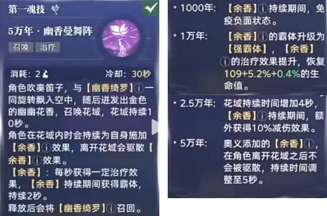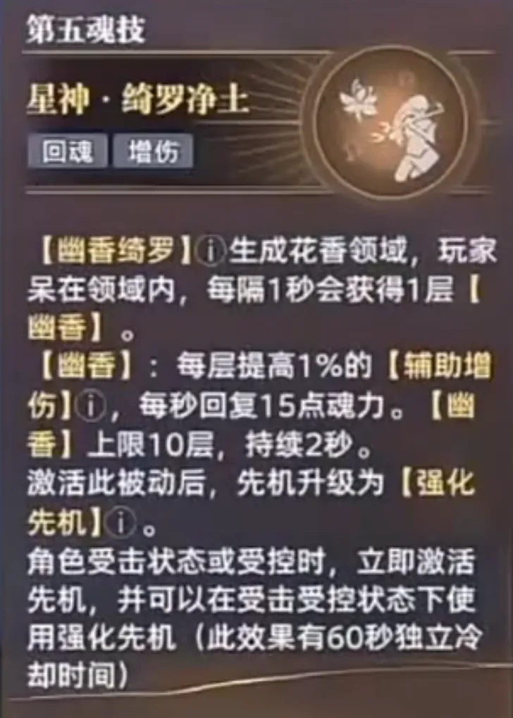 然后6魂技则是可以将幽香绮罗给召唤到自身周围,同时获得免控效果,这个在PVP中虽然只有2秒的时间,但也是足够有意义了,最后这个魂技也有驱散和回复生命的效果。