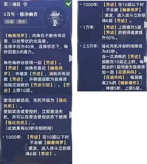 接着5被动嘛则是相反会不断积累“幽香”状态,其中幽香满层时神赐魂环可以让叶原额外提供8%的最终伤害提升,这个幅度倒是和之前的类似于小舞等角色类似,不过综合对于一位辅助角色而言,维一个人认为还是设计的稍显保守了点,给到10%左右应该也是可以接受的吧。然后5被动最大的问题是要想快速回能,一是需要幽香得达到10层,二就是此回能效果360秒才能触发一次......官方真是跟360秒这个时间阈值干上了啊,很多设定都喜欢来来一波360秒的限制。