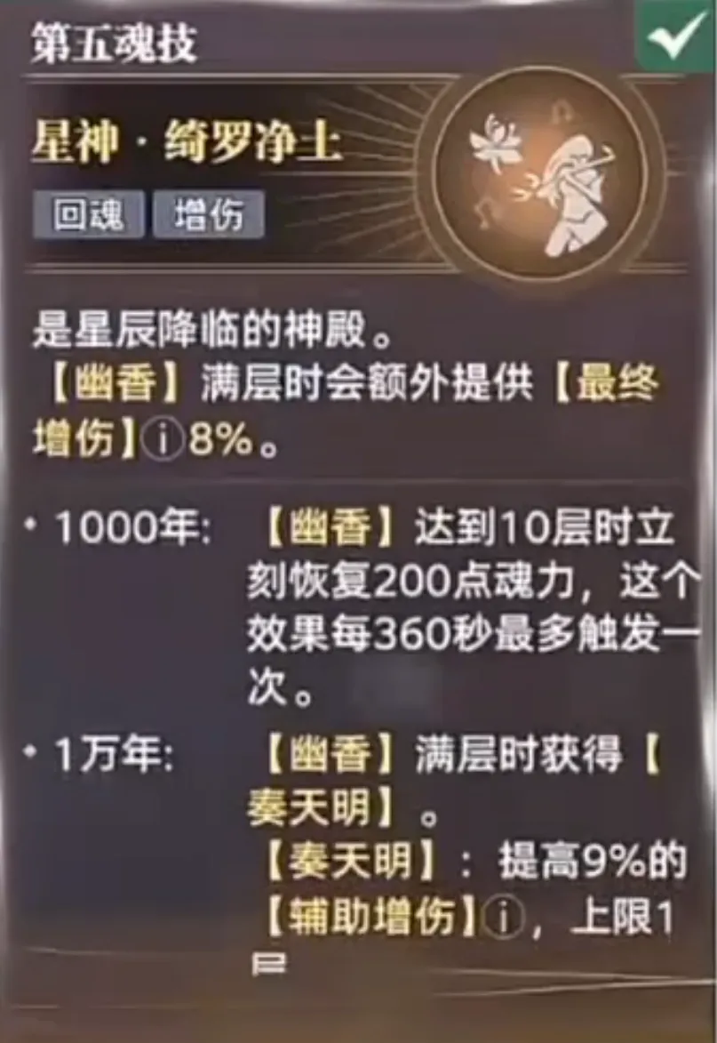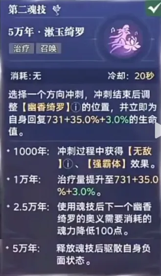 接着其2魂技可以直接冲向幽香绮罗的位置并回血,并且还能降低下个奥义的能量消耗,相当于奥义就是100点魂力即可释放,最后2技能依然会有一个驱散的效果。