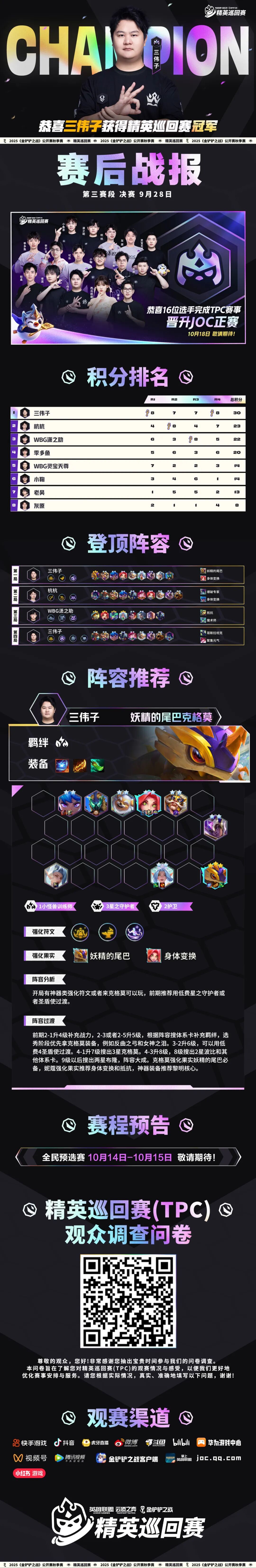 恭喜【三伟子】获得精英巡回赛冠军!从首局用妖精的尾巴克格莫第一到末局用星守狙神金克丝登顶锁定胜局,他用两次巅峰表现,证明了谁才是最终赢家!