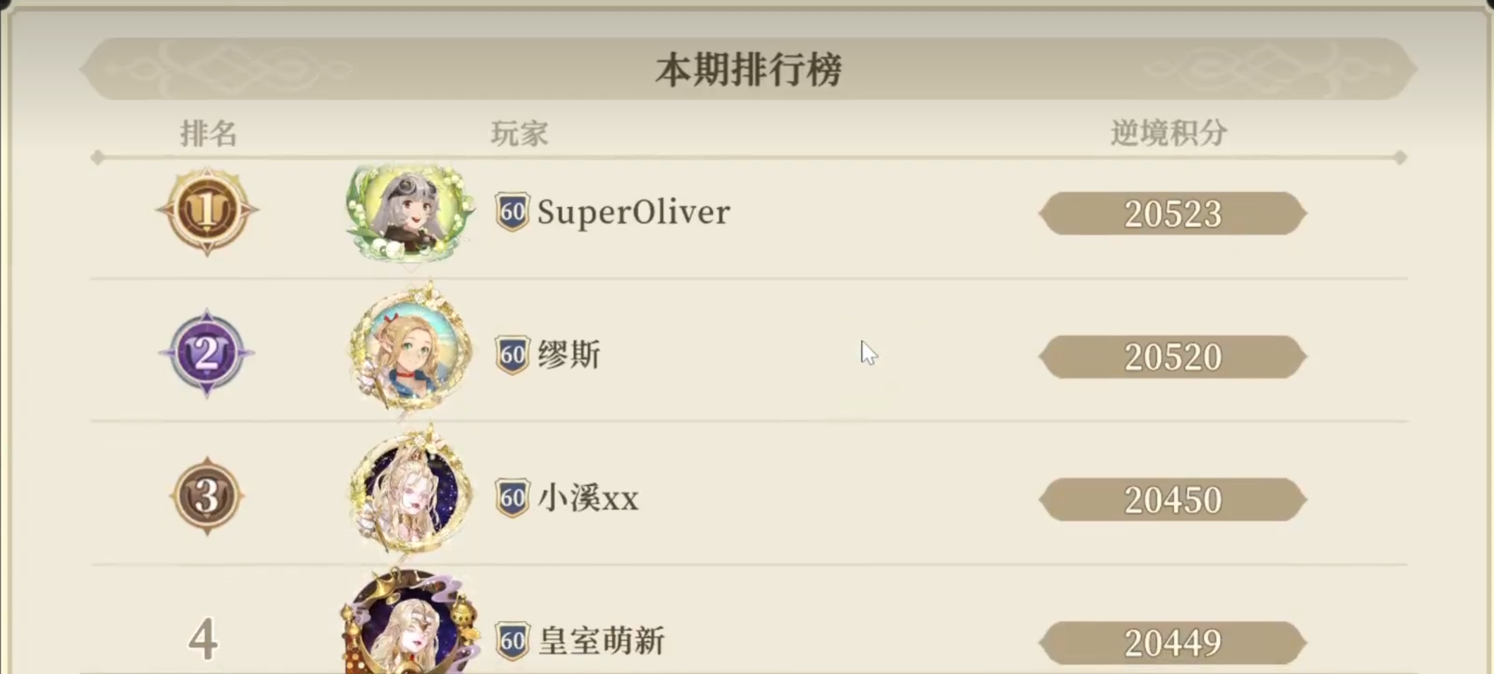 逆2:在4月的第二期「逆境之塔」第七层的顶分阵容中出现过